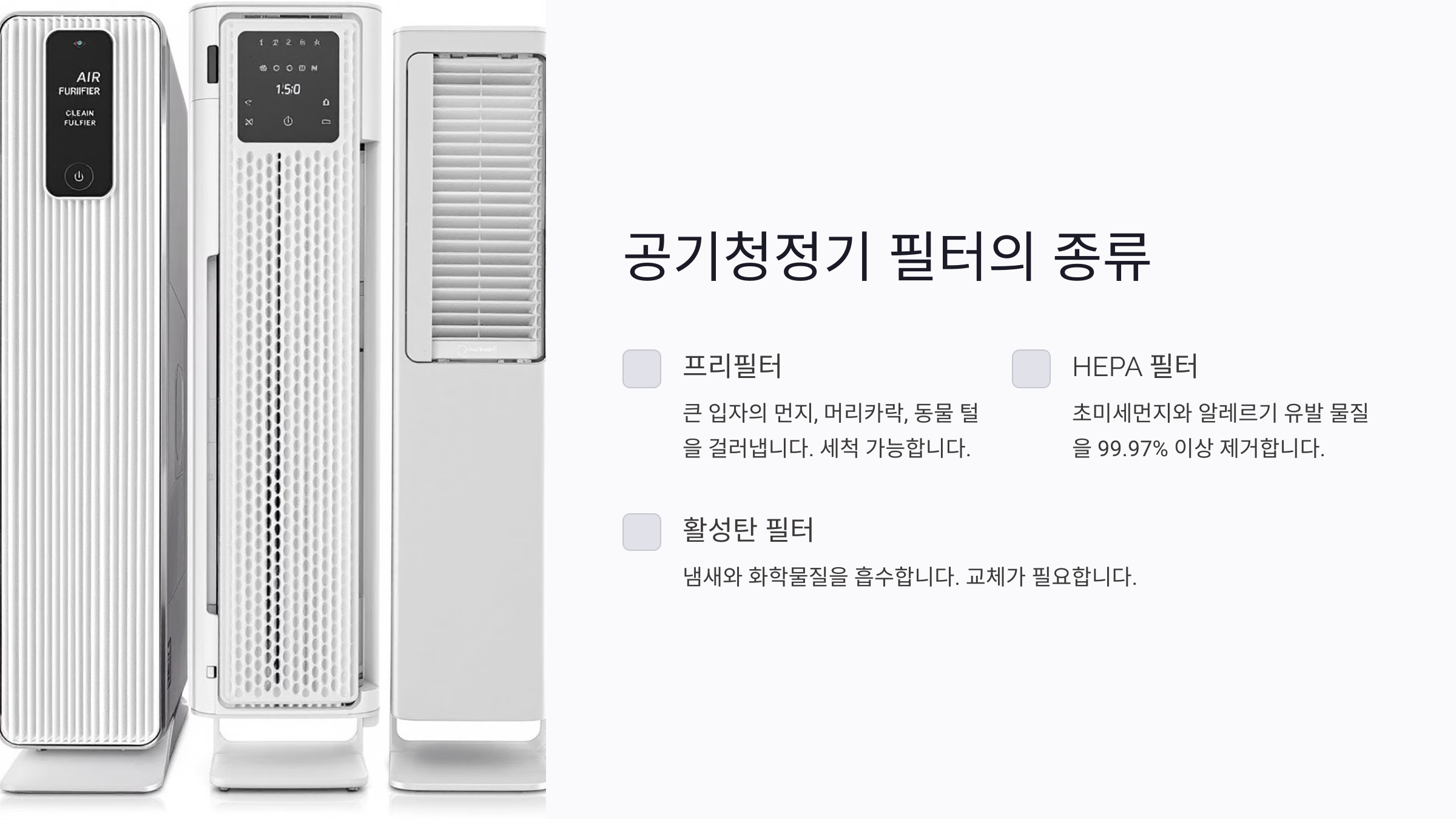 공기청정기 필터는 일반적으로 3가지로 나뉘어요: 프리필터, HEPA 필터, 활성탄 필터. 각 필터는 공기 중의 오염 물질을 제거하는 데 중요한 역할을 해요.