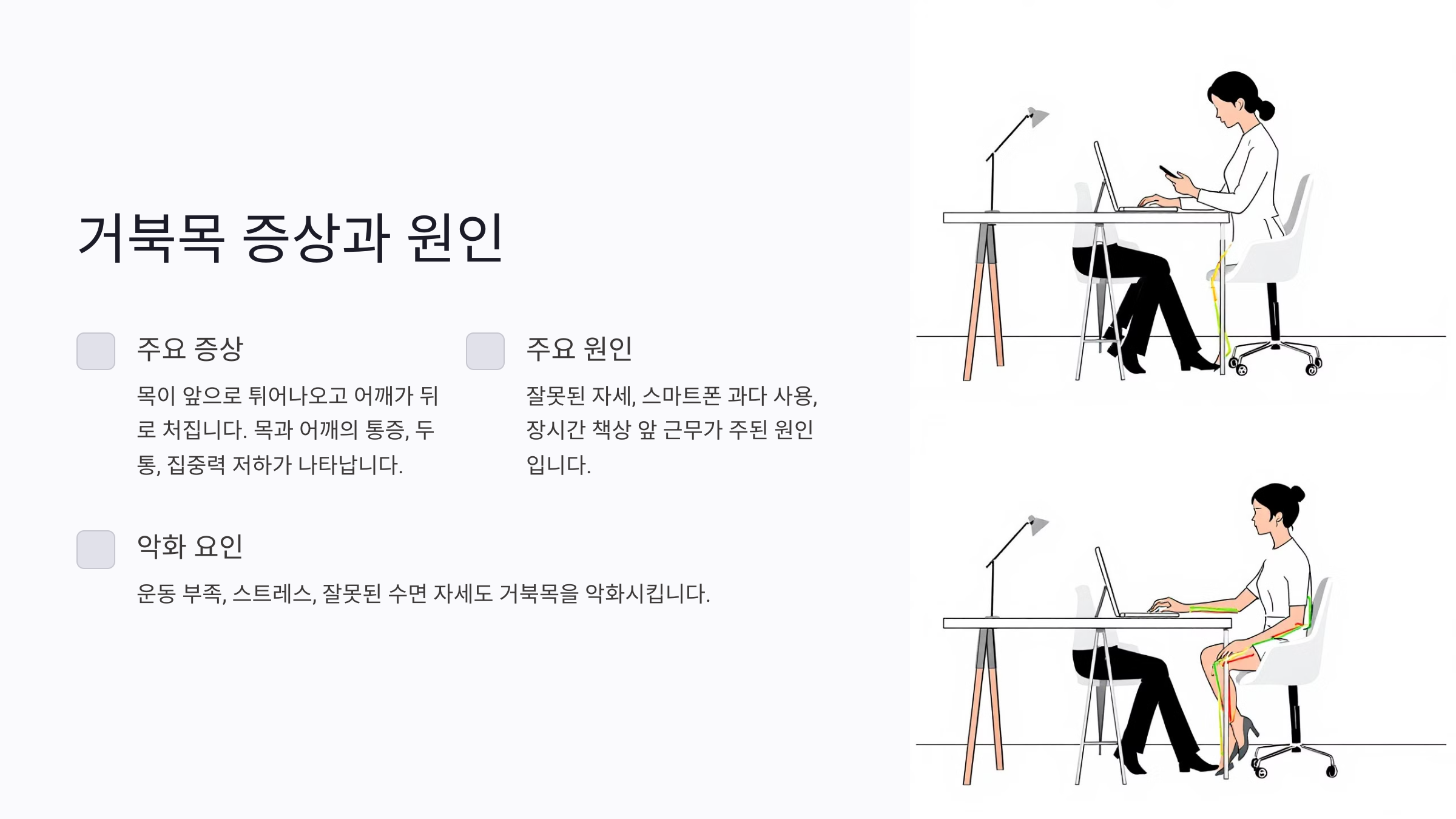 거북목이 발생하는 주요 원인은 잘못된 자세와 생활 습관이에요. 스마트폰이나 노트북 사용 시 고개를 숙이거나 목을 앞으로 내미는 자세를 지속하면 목과 어깨 근육에 무리가 가요. 특히, 한국에서는 학업이나 업무로 인해 책상 앞에서 오랜 시간을 보내는 사람들이 많아 이런 문제가 더욱 두드러지죠.
