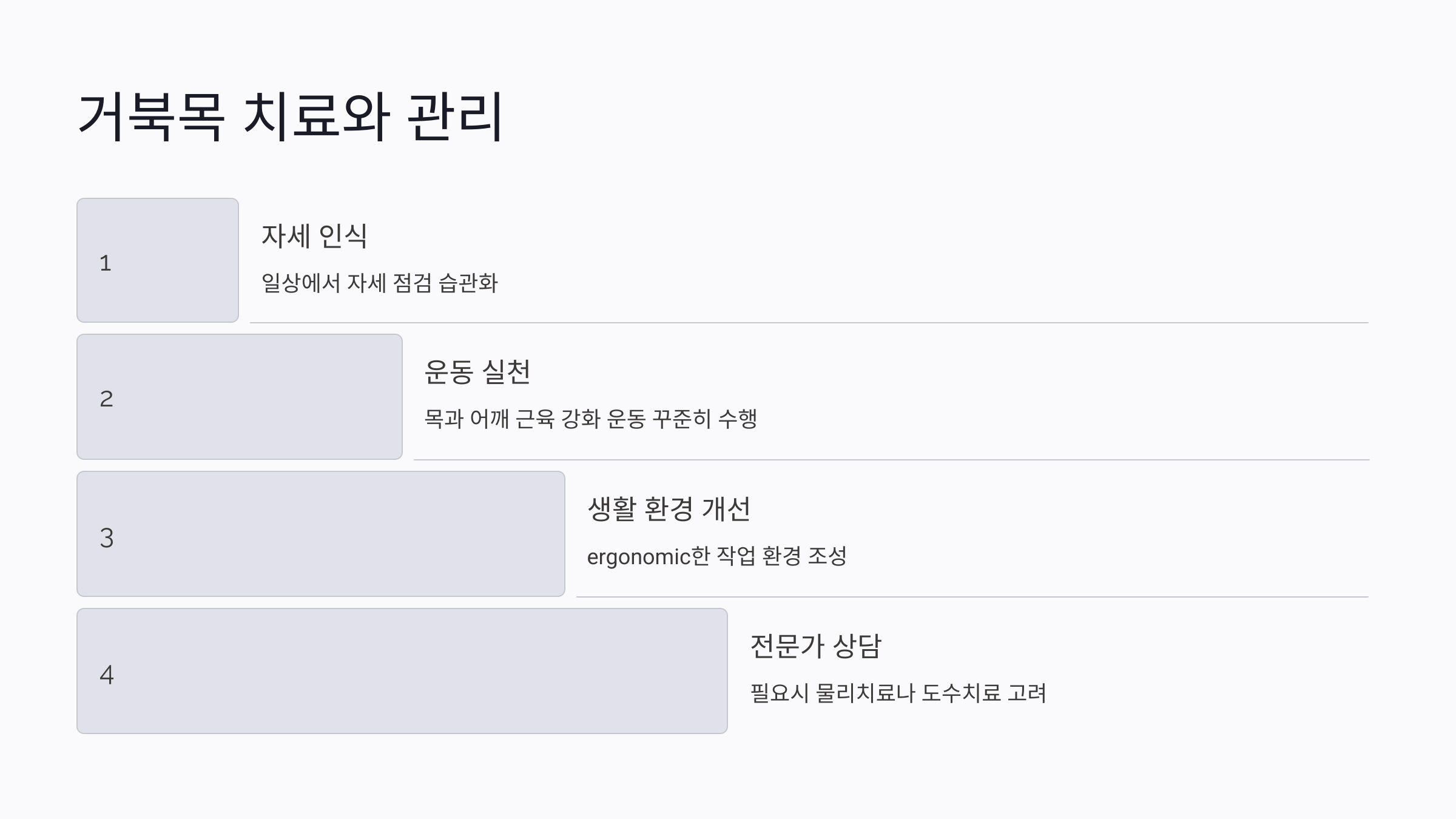 또 다른 원인으로는 운동 부족과 근육 약화가 있어요. 목과 어깨 주변의 근육이 충분히 강하지 않으면, 잘못된 자세를 지탱하기 어렵게 돼요. 특히 한국에서는 학업이나 직장 업무로 인해 움직임이 적은 생활을 하는 사람들이 많아 이 문제가 더욱 심각하게 나타나곤 해요.