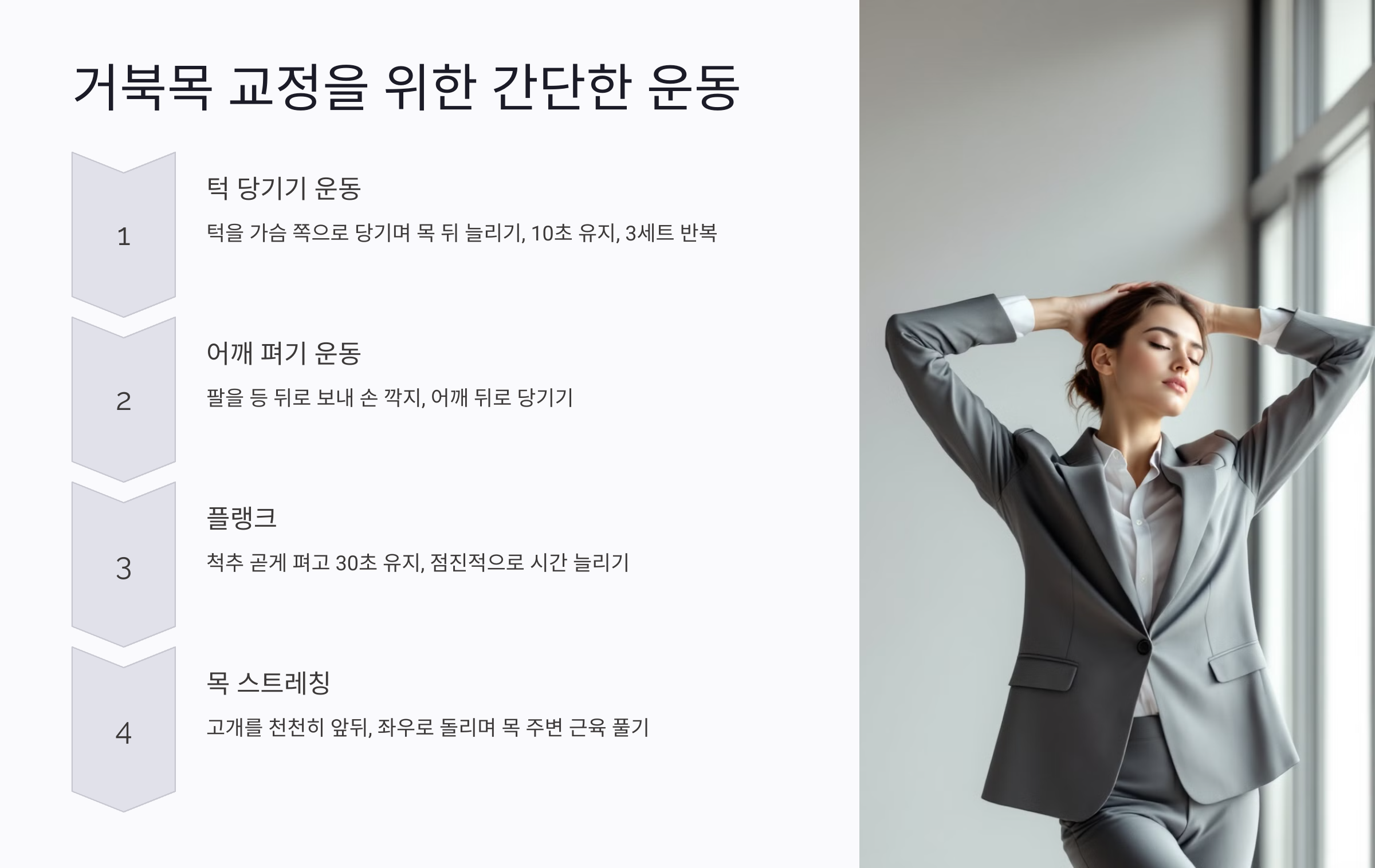 거북목 교정을 위해 간단한 운동부터 시작해보세요. 먼저 "턱 당기기 운동"은 가장 기본적이고 효과적인 운동이에요. 똑바로 앉은 상태에서 턱을 가슴 쪽으로 당기며 목 뒤를 길게 늘리는 동작을 10초간 유지해보세요. 이를 하루 3세트 반복하면 목 뒤 근육이 강화돼요.