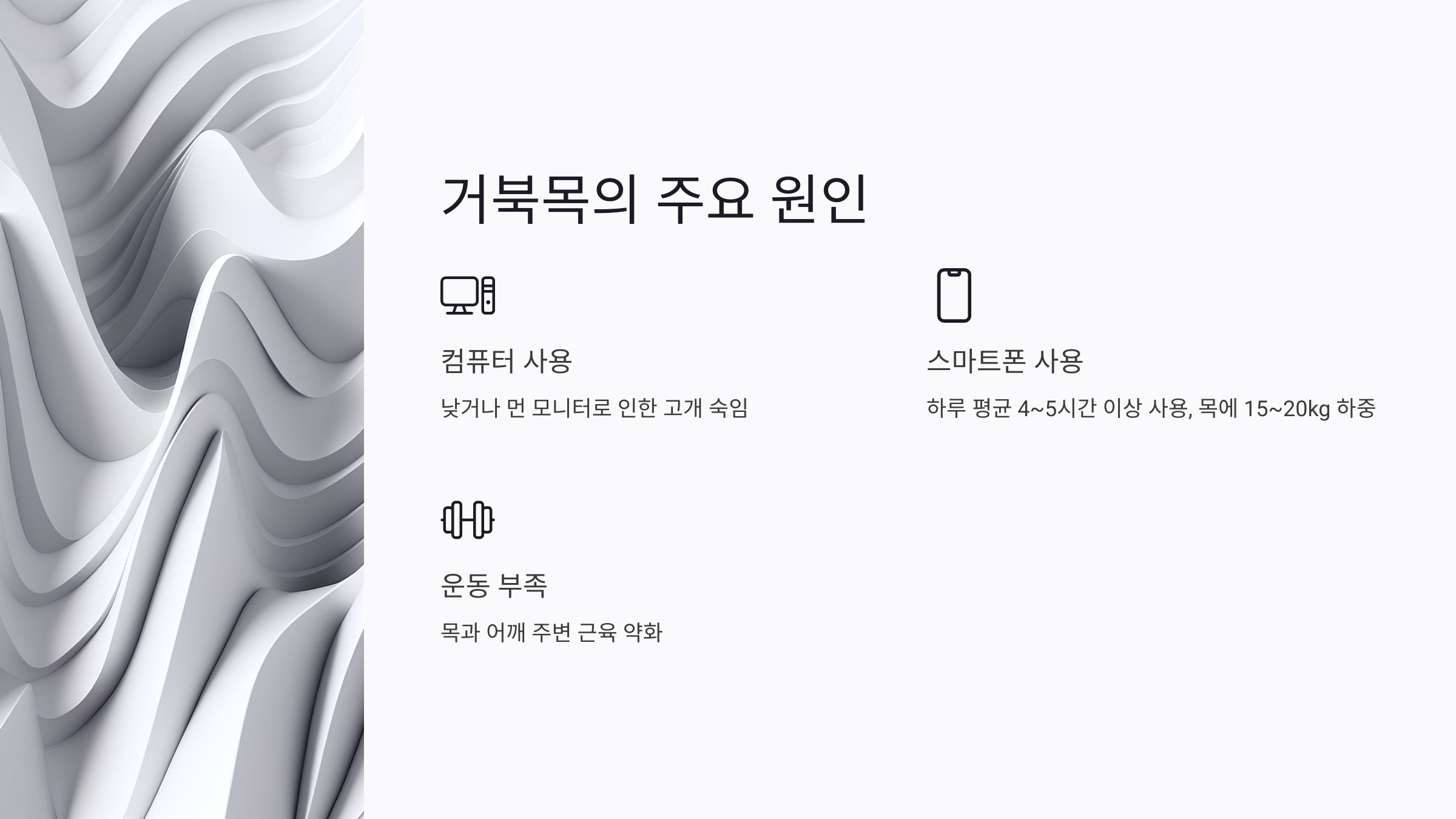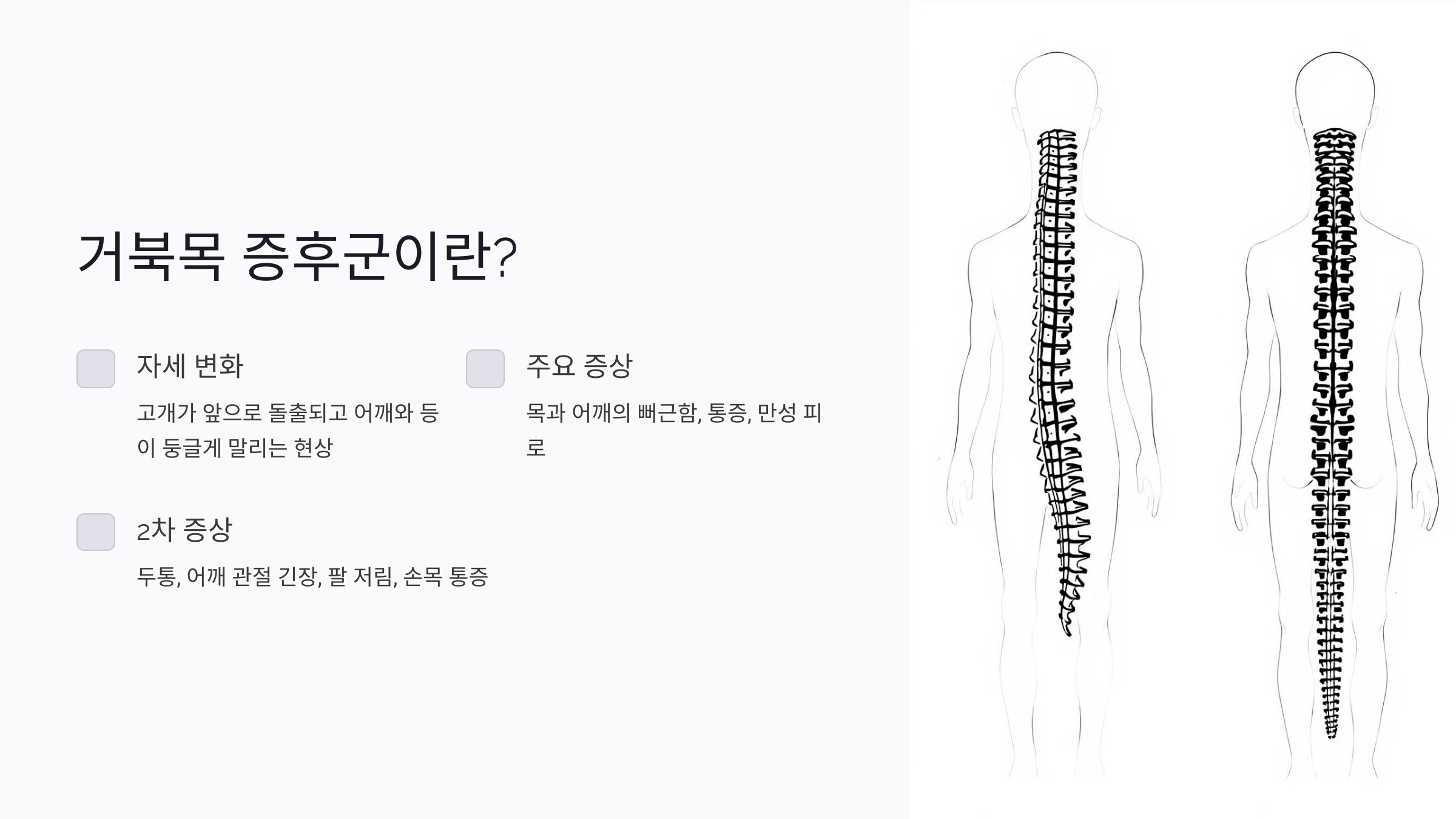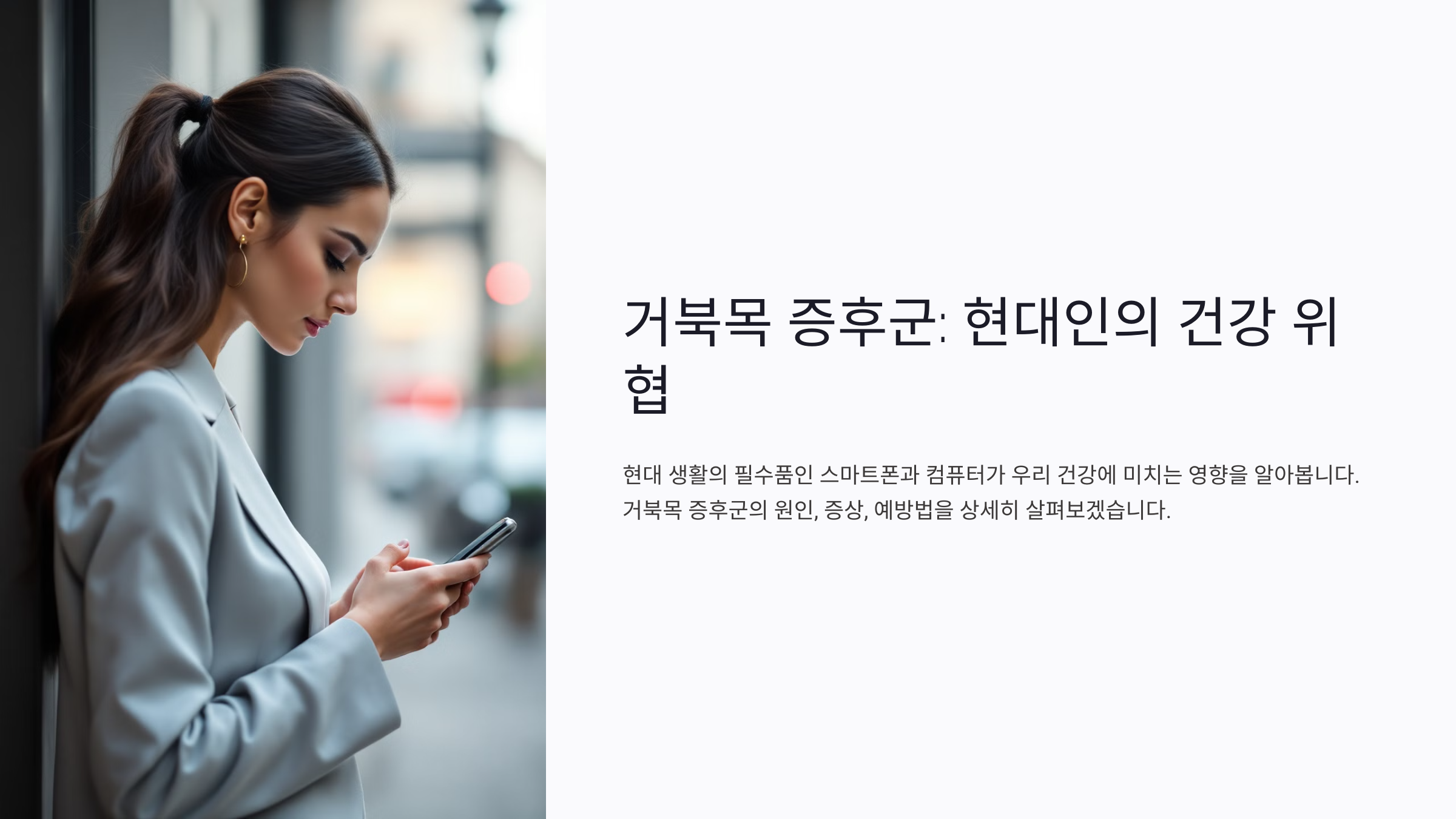 현대인의 필수 아이템인 스마트폰과 컴퓨터는 우리의 일상을 편리하게 만들어주는 도구이지만, 이와 동시에 거북목 증후군이라는 새로운 건강 문제를 불러일으켰어요. 거북목은 단순히 목이 앞으로 빠지는 자세 문제가 아니라, 척추 정렬을 무너뜨리고 통증, 피로, 심지어 장기적인 건강 문제로까지 이어질 수 있는 심각한 상태예요.