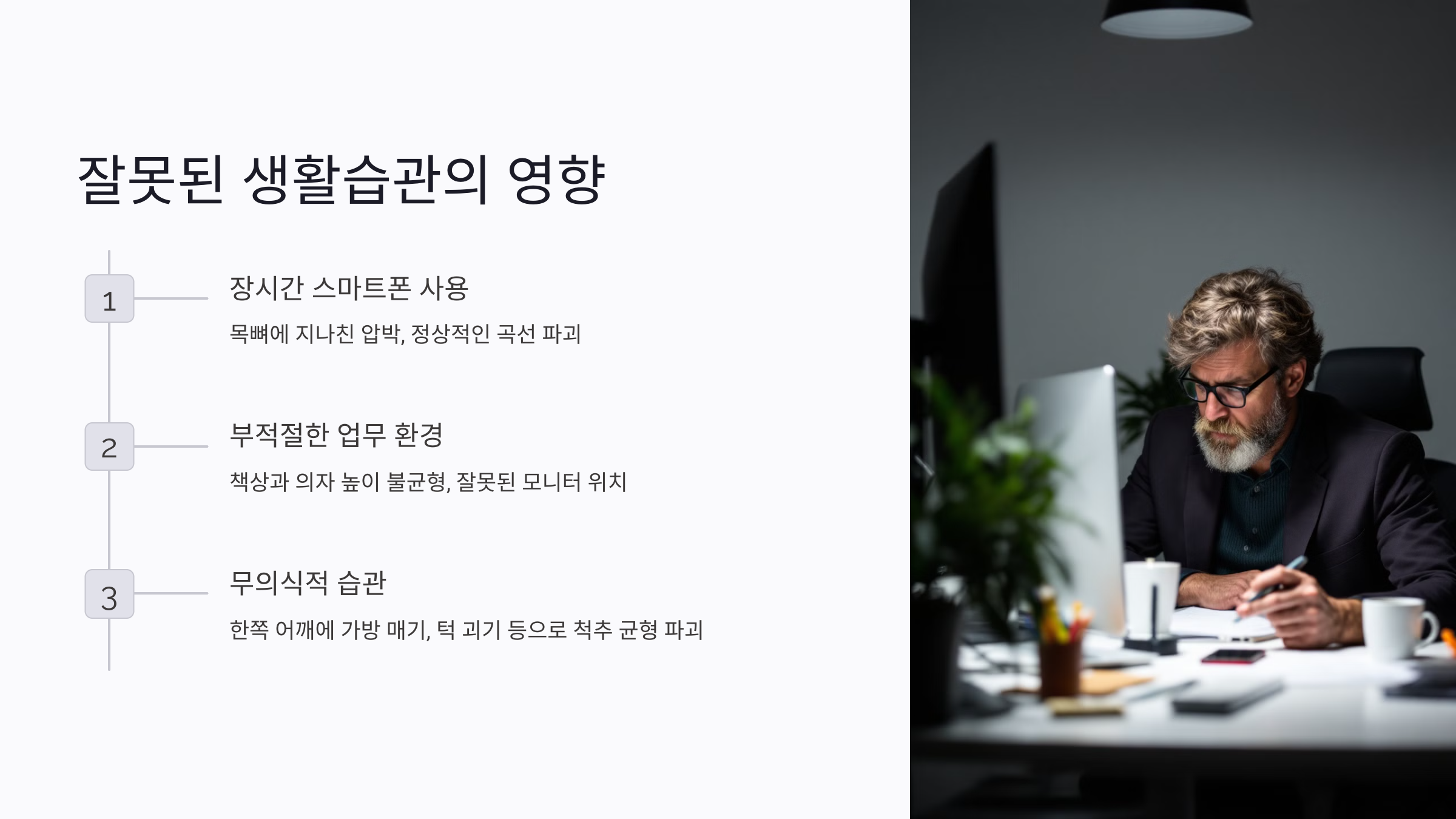잘못된 생활습관은 거북목을 악화시키는 주요 원인 중 하나예요. 예를 들어, 장시간 스마트폰을 사용할 때 목을 숙이는 자세는 목뼈에 지나친 압박을 주어 정상적인 곡선을 망가뜨려요. 특히, 침대나 소파에서 스마트폰을 사용하는 경우, 목과 어깨 근육에 더 많은 스트레스를 주게 된답니다.