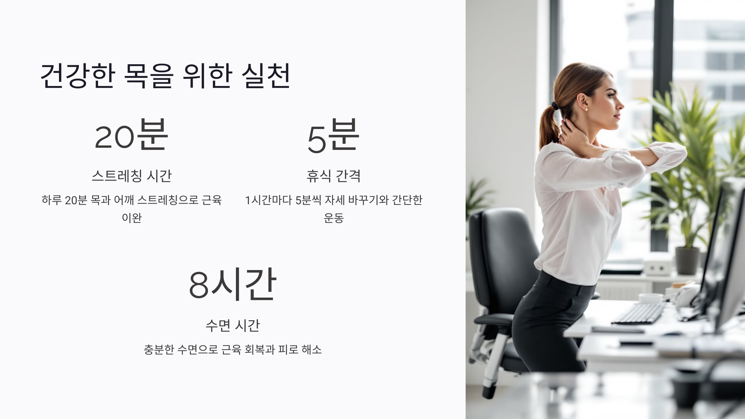 마지막으로, 고개를 천천히 앞뒤로, 좌우로 돌리며 목 주변 근육을 풀어주는 스트레칭도 잊지 마세요. 이 간단한 동작은 하루 중 틈틈이 할 수 있어 바쁜 직장인들에게도 적합해요. 꾸준히 실천한다면 거북목 교정에 큰 변화를 느낄 수 있을 거예요.