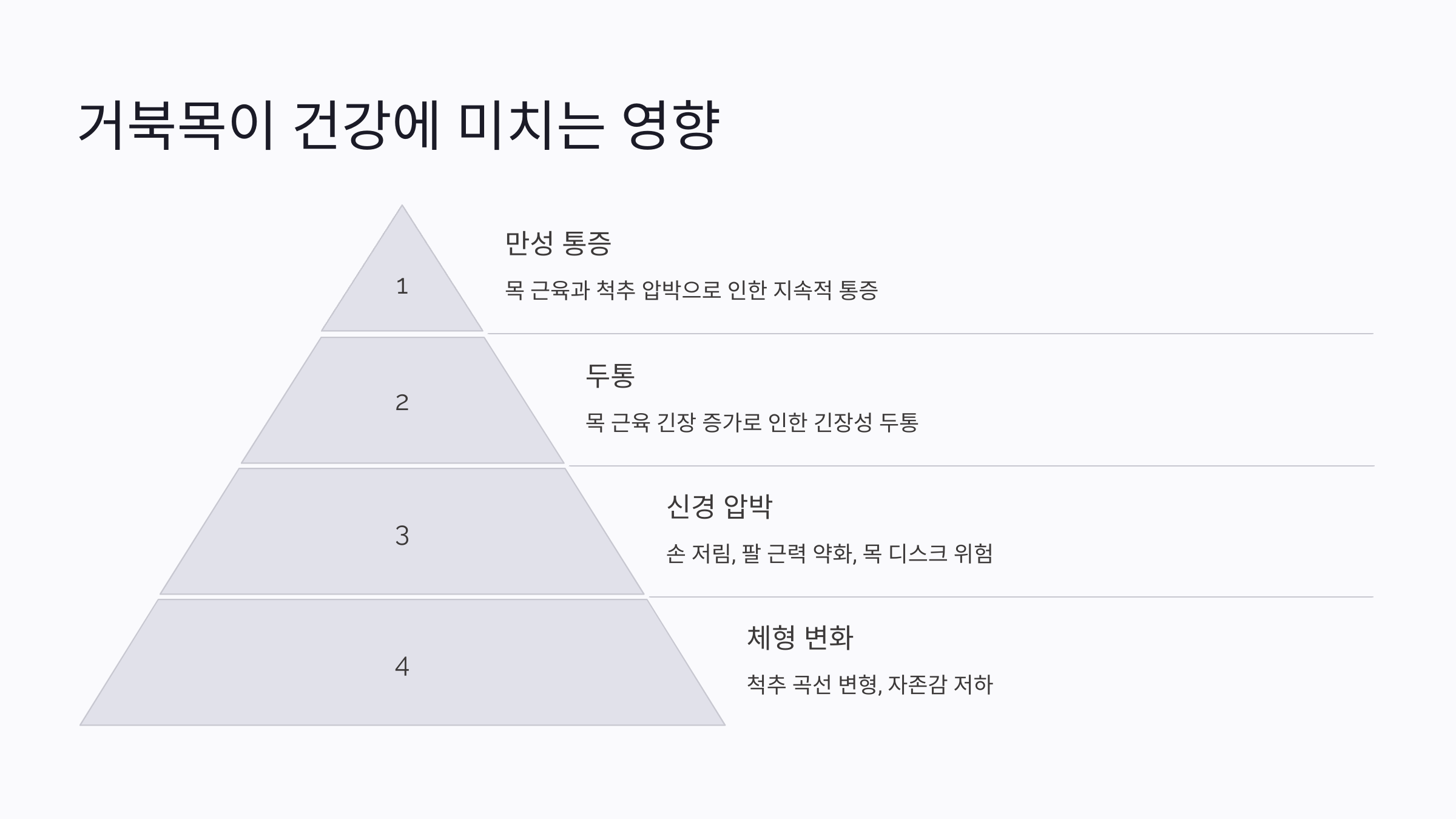 거북목은 단순히 외관상의 문제에 그치지 않고, 장기적으로 심각한 건강 문제를 유발할 수 있어요. 첫째, 목 근육과 척추에 가해지는 과도한 압박으로 인해 만성적인 통증이 발생할 수 있어요. 이로 인해 업무나 학업의 효율성이 크게 떨어질 수 있답니다.