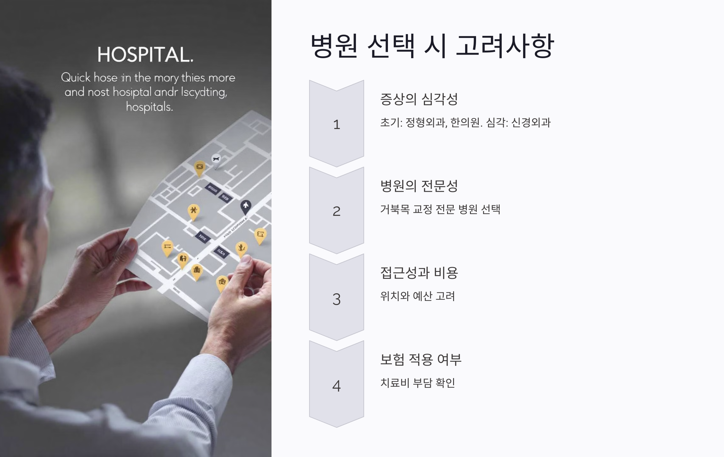2. 병원의 전문성: 치료 경험이 풍부한 병원이나 거북목 교정을 전문으로 하는 곳을 선택하는 것이 좋아요. 병원 리뷰나 추천을 참고해보세요.