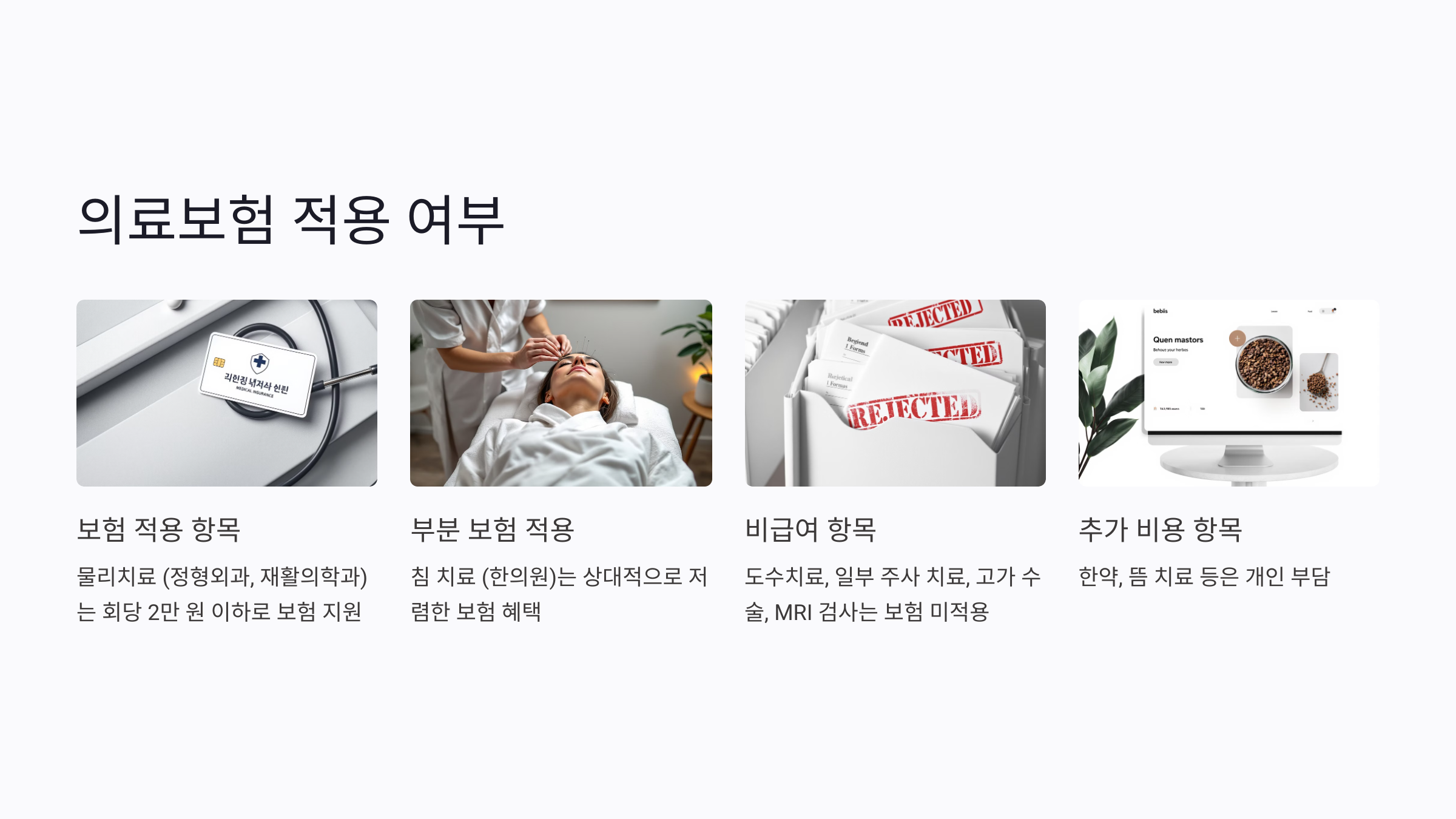 A8. 도수치료, 한약, 일부 주사 치료는 비급여 항목으로, 환자가 전액 부담해야 해요. 병원 방문 전에 보험 적용 여부를 확인하세요.
