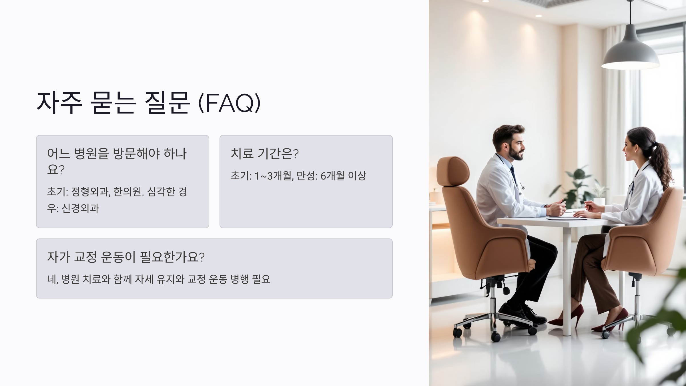 A1. 초기 증상은 정형외과나 한의원에서 시작해보세요. 만약 통증이 심하거나 신경 눌림 증상이 있다면 신경외과를 추천해요.
