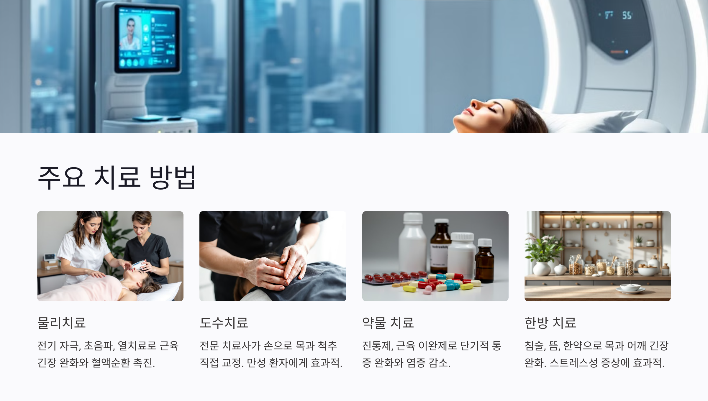 A6. 침술과 한약은 목과 어깨의 긴장을 완화하고 통증을 줄이는 데 효과적이에요. 다만, 자세 교정 운동도 병행해야 더 좋은 결과를 얻을 수 있어요.