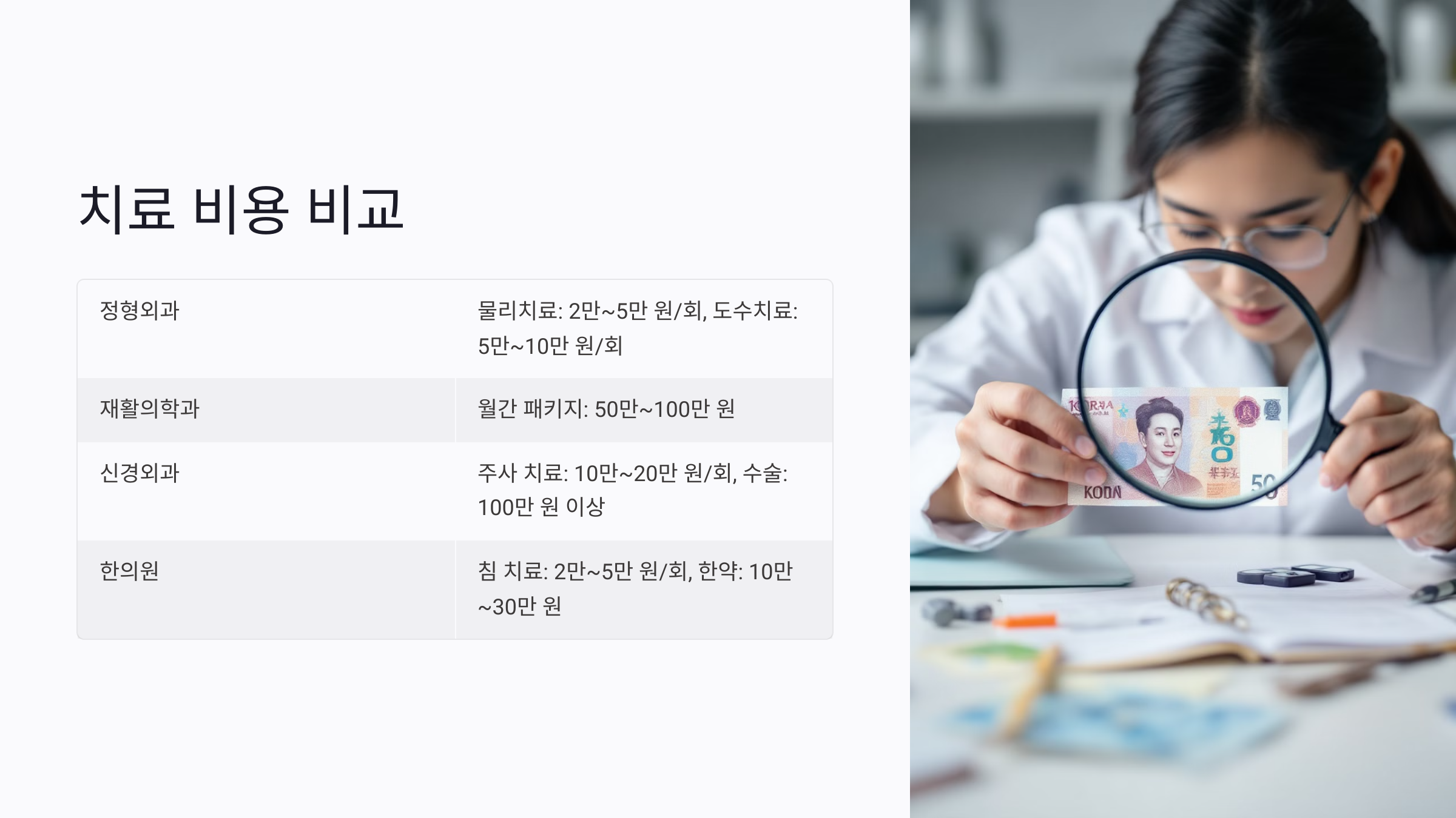 3. 신경외과: 신경 차단술 같은 주사 치료는 회당 10만~20만 원 정도이며, 수술이 필요한 경우 100만 원 이상의 비용이 들어갈 수 있어요. 보험 적용 여부에 따라 차이가 크답니다.