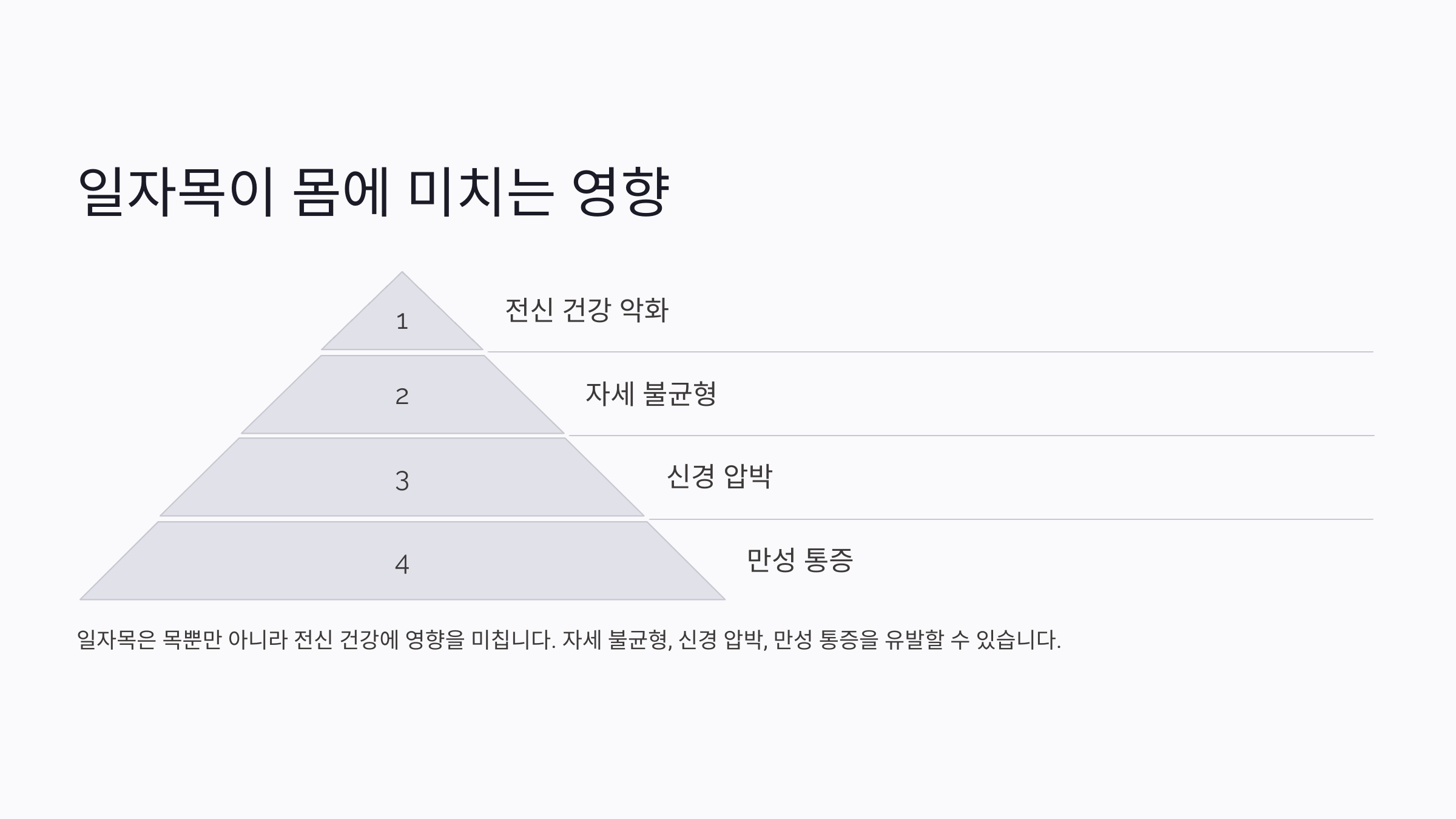 일자목은 단순히 목에만 영향을 미치는 것이 아니라, 전신 건강에 영향을 줄 수 있어요. 특히 목뼈가 앞으로 쏠리면 어깨, 등, 허리의 근육과 관절에 과도한 부담을 주게 돼요. 이는 자세 불균형을 초래해 만성적인 통증을 유발할 수 있어요.