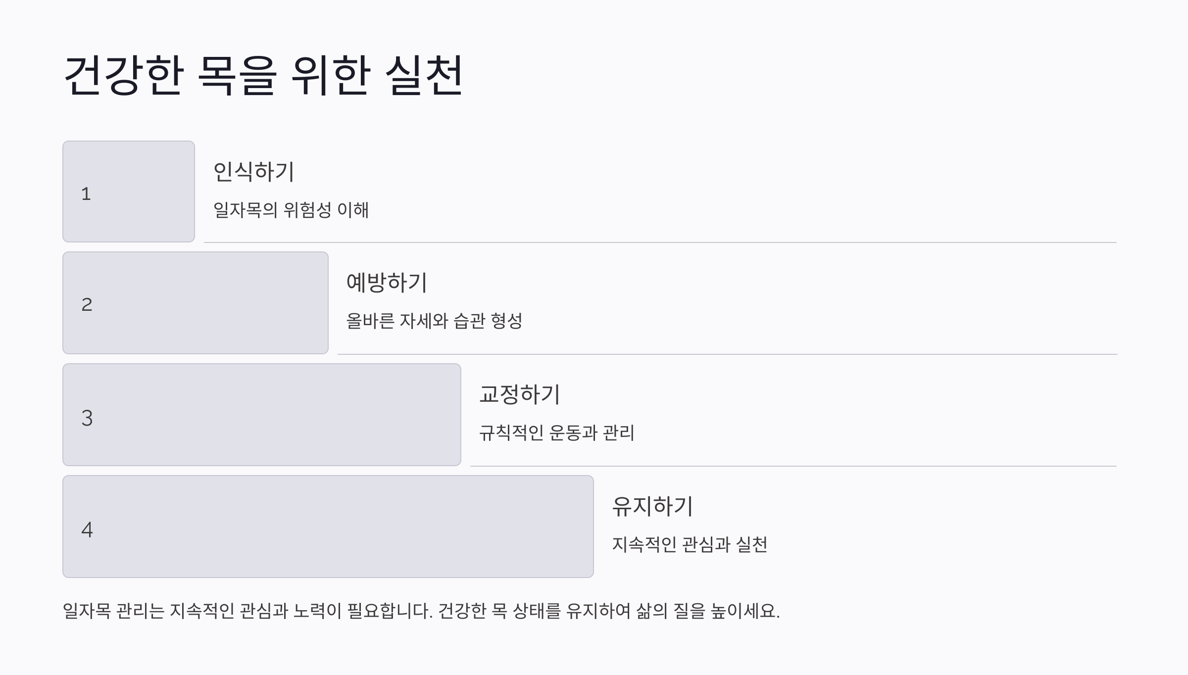일자목을 예방하려면 올바른 자세를 유지하는 것이 가장 중요해요. 스마트폰이나 모니터를 사용할 때는 화면을 눈높이로 맞추고, 고개를 숙이지 않도록 주의하세요.