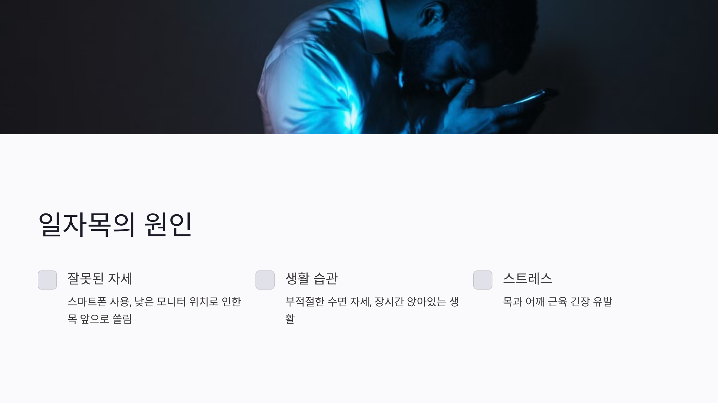 이 외에도 사고로 인한 목의 외상, 근육 약화, 척추의 유연성 저하 등이 일자목의 발생 원인으로 작용할 수 있어요. 한 가지 요인만이 아니라 여러 요인이 복합적으로 작용해 일자목 문제가 발생하는 경우가 많아요.