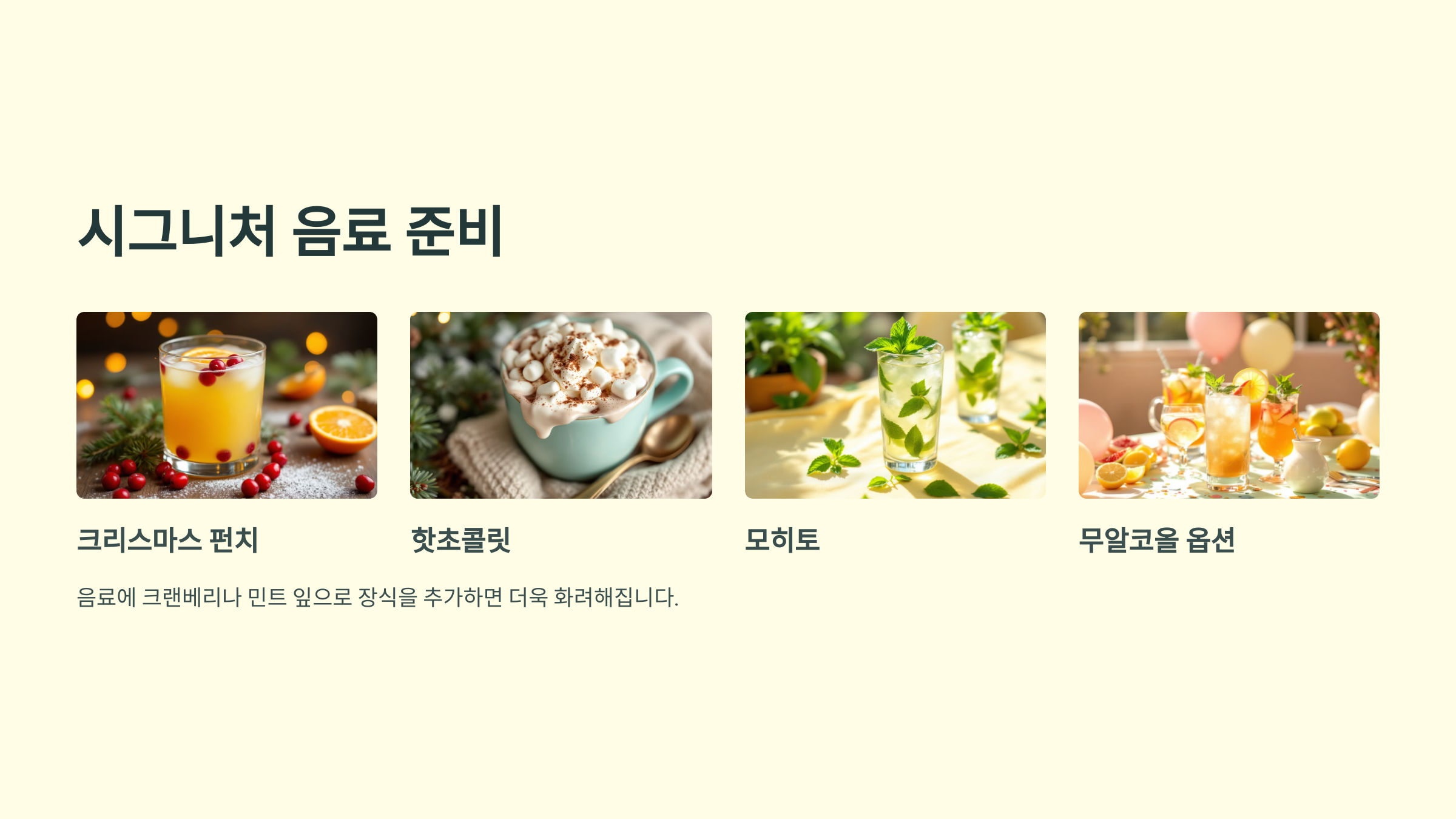크리스마스 펀치, 핫초콜릿, 혹은 모히토와 같은 특별한 음료를 준비해보세요.