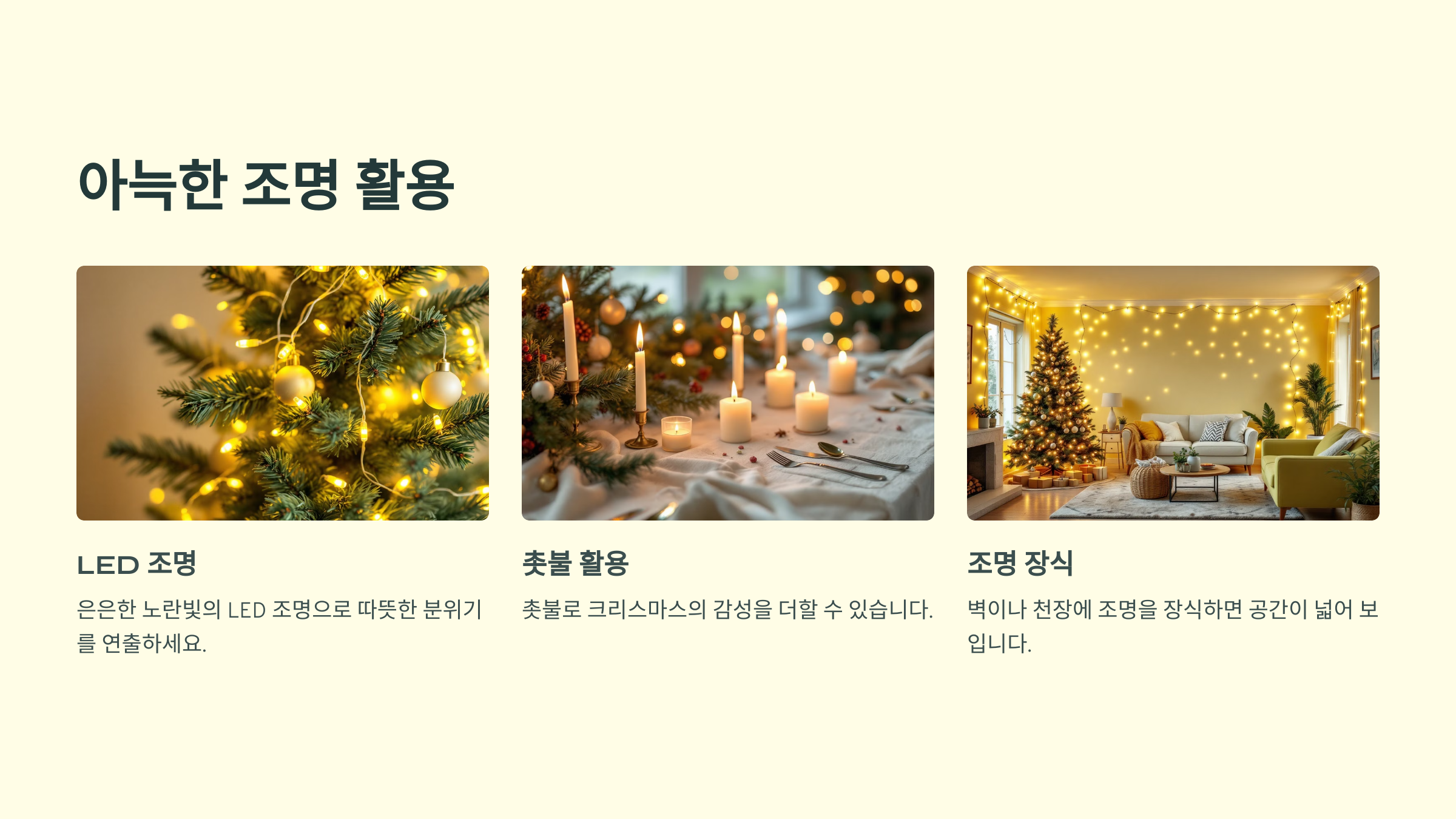 촛불이나 전구를 이용해 크리스마스의 감성을 더할 수 있습니다.