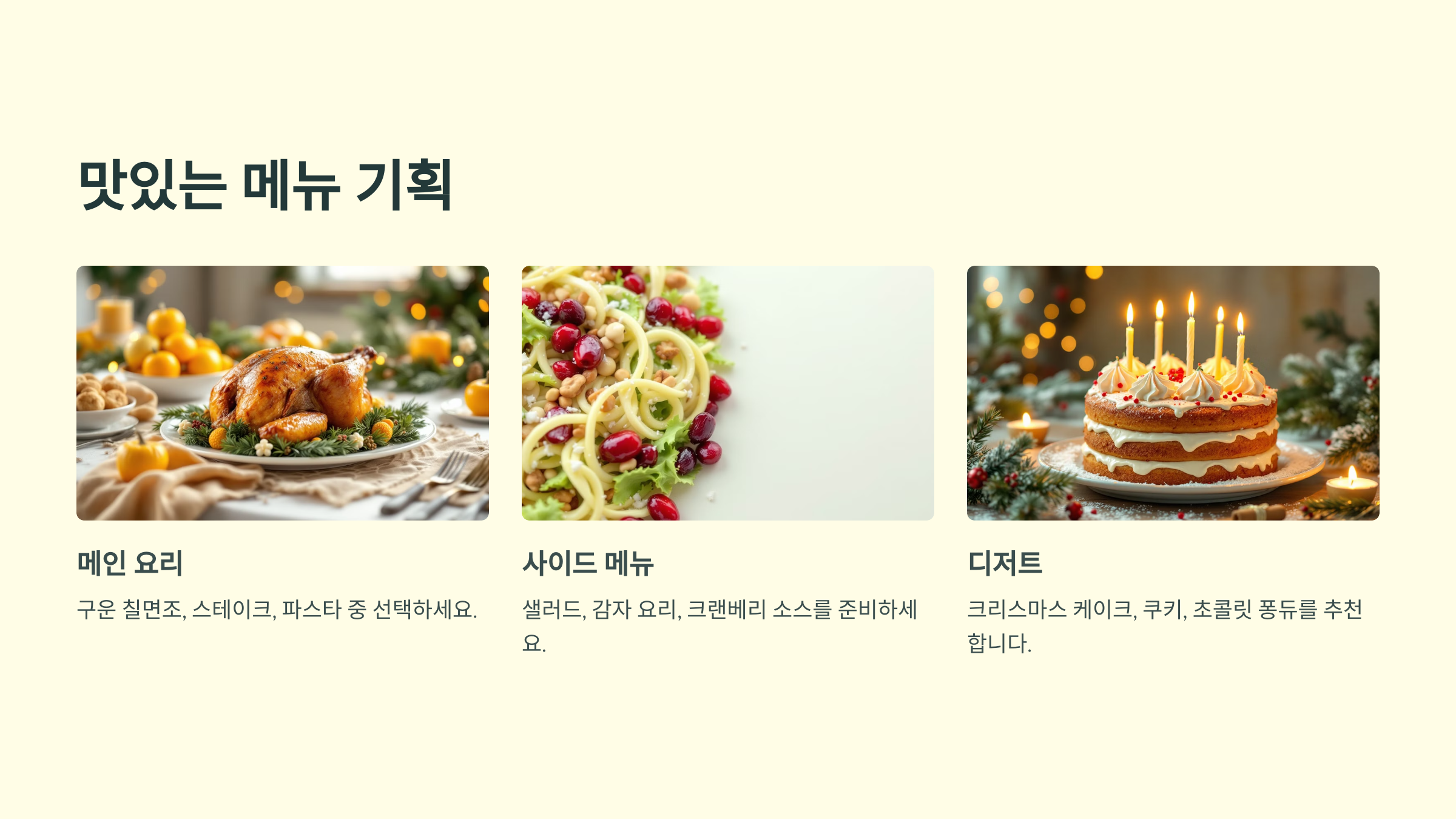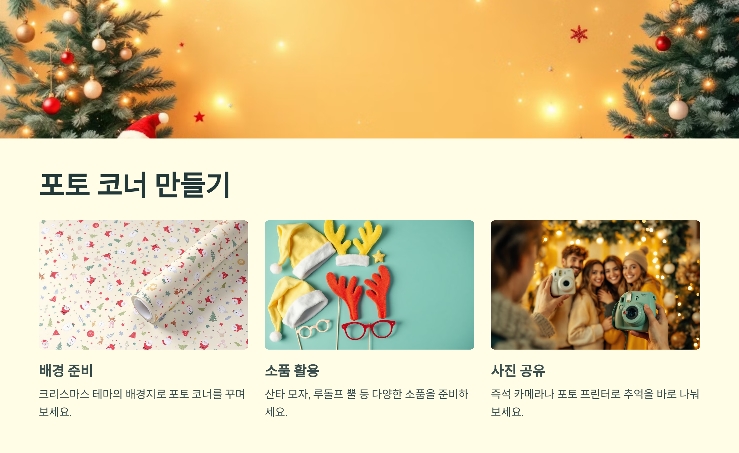 A: 크리스마스 배경지와 테마 소품을 활용해 꾸미고, 조명을 추가해 분위기를 살리세요.
