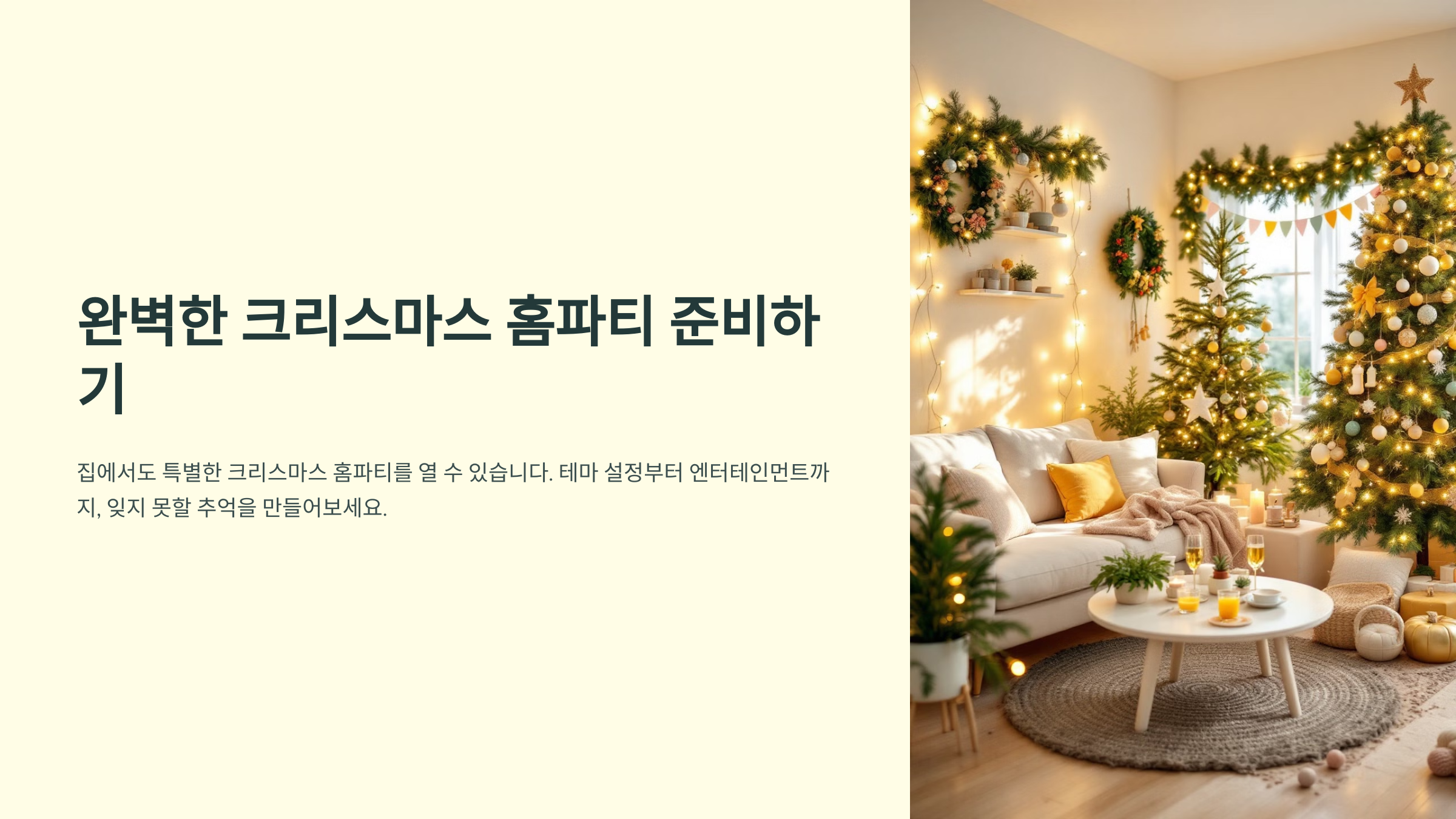 집에서도 완벽한 크리스마스 홈파티를 준비할 수 있습니다! 테마 설정부터 분위기를 살리는 조명까지, 손쉽게 따라 할 수 있는 팁들을 소개합니다. 친구와 가족들과 함께 잊지 못할 추억을 만들어보세요.