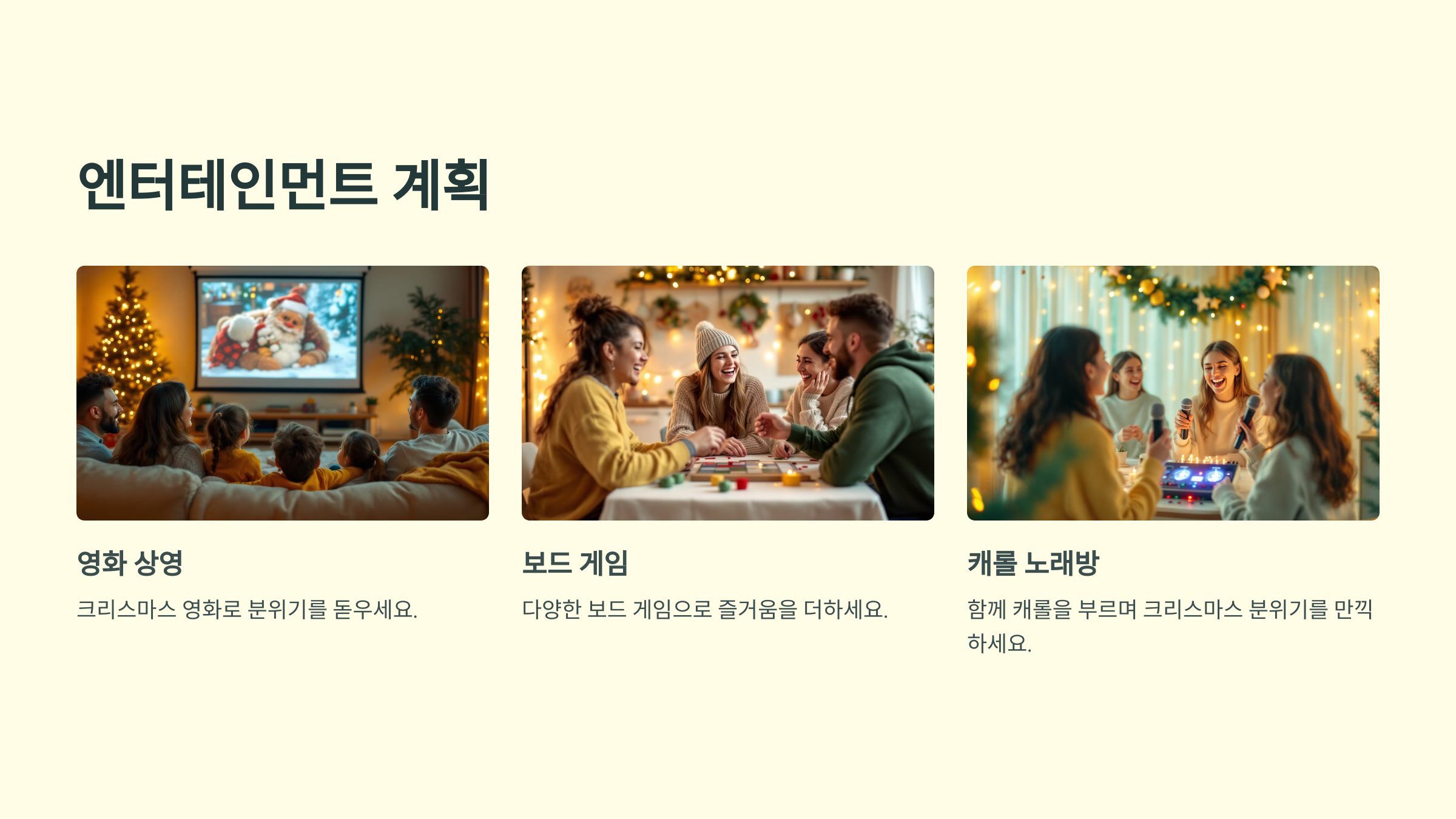 크리스마스 영화 상영, 보드 게임, 혹은 캐롤 노래방을 준비하세요.