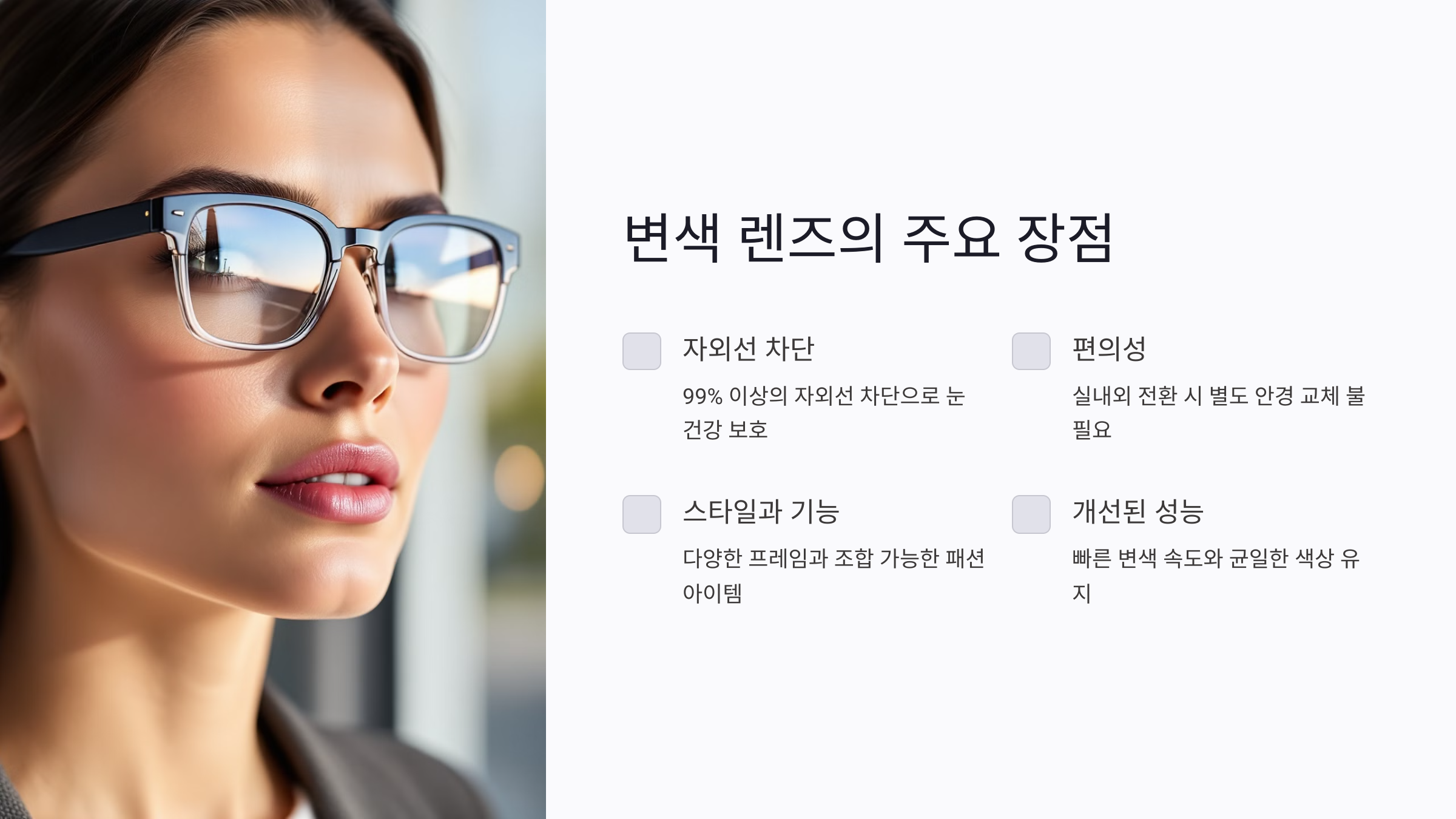 세 번째로, 스타일과 기능을 동시에 잡을 수 있어요. 변색 렌즈는 다양한 프레임과 조합할 수 있고, 어두운 색상으로 변하면 자연스럽게 선글라스처럼 보이기도 해요. 그래서 따로 선글라스를 구입할 필요 없이 패션 아이템으로도 활용 가능하답니다.