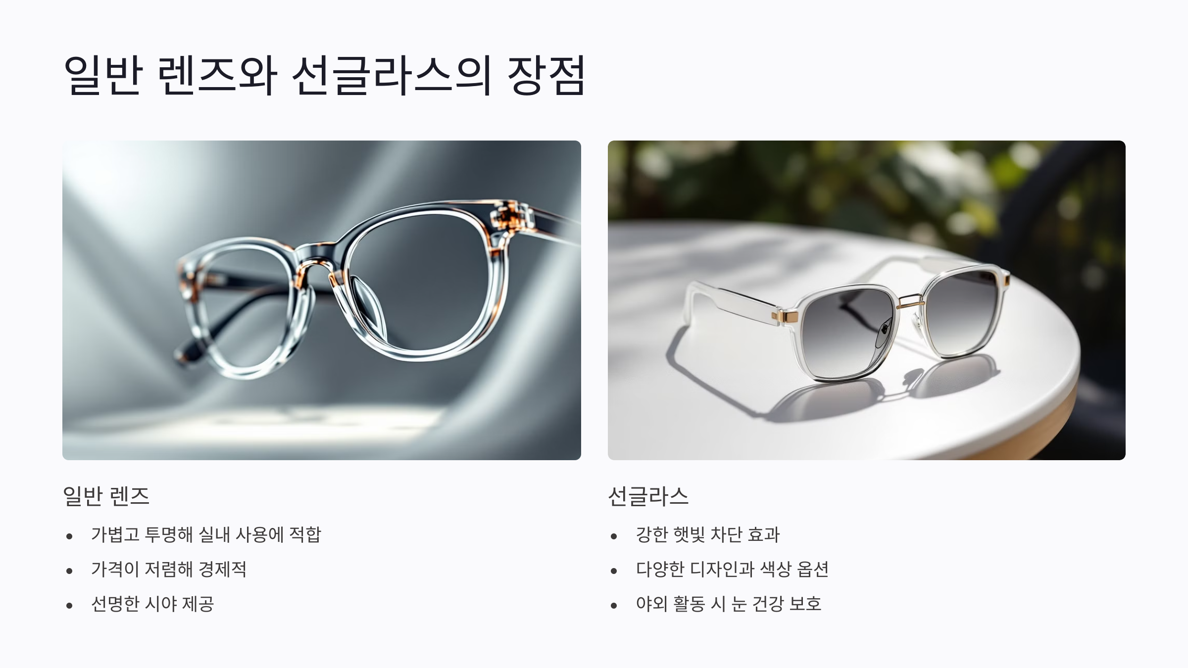 두 가지 제품 모두 특정 환경에 맞게 특화되어 있어, 특정 활동에 집중할 때 유용하게 사용할 수 있어요. 예를 들어, 선글라스는 강렬한 햇빛 아래에서 필수적인 역할을 하고, 일반 렌즈는 실내에서 장시간 착용하기 적합해요.