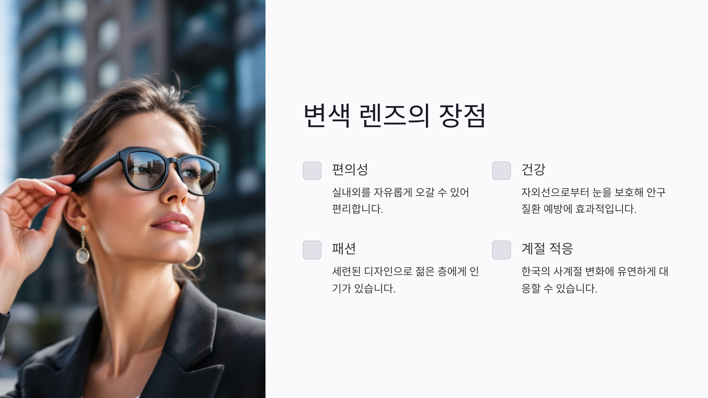 네 번째로, 국내 실정에 잘 맞아요. 한국은 사계절이 뚜렷하고, 봄과 여름에는 강한 햇빛, 가을과 겨울에는 낮은 자외선에 맞춘 렌즈 사용이 필요해요. 변색 렌즈는 이러한 계절 변화에 유연하게 대응할 수 있어요.