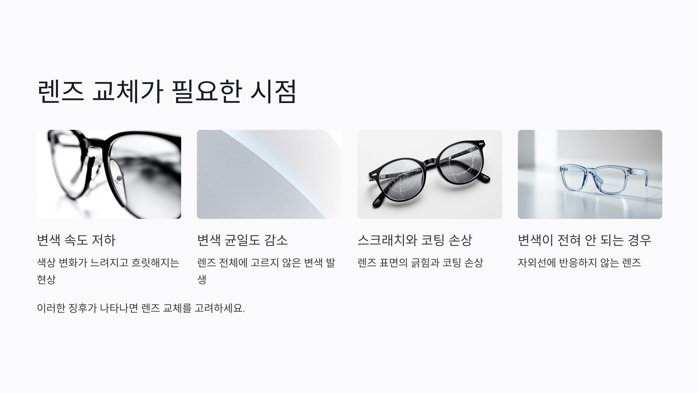 변색 렌즈의 성능이 떨어지거나 손상이 발생하면 적절한 시기에 교체하는 것이 중요해요. 다음은 렌즈를 교체해야 할 주요 신호들이에요: