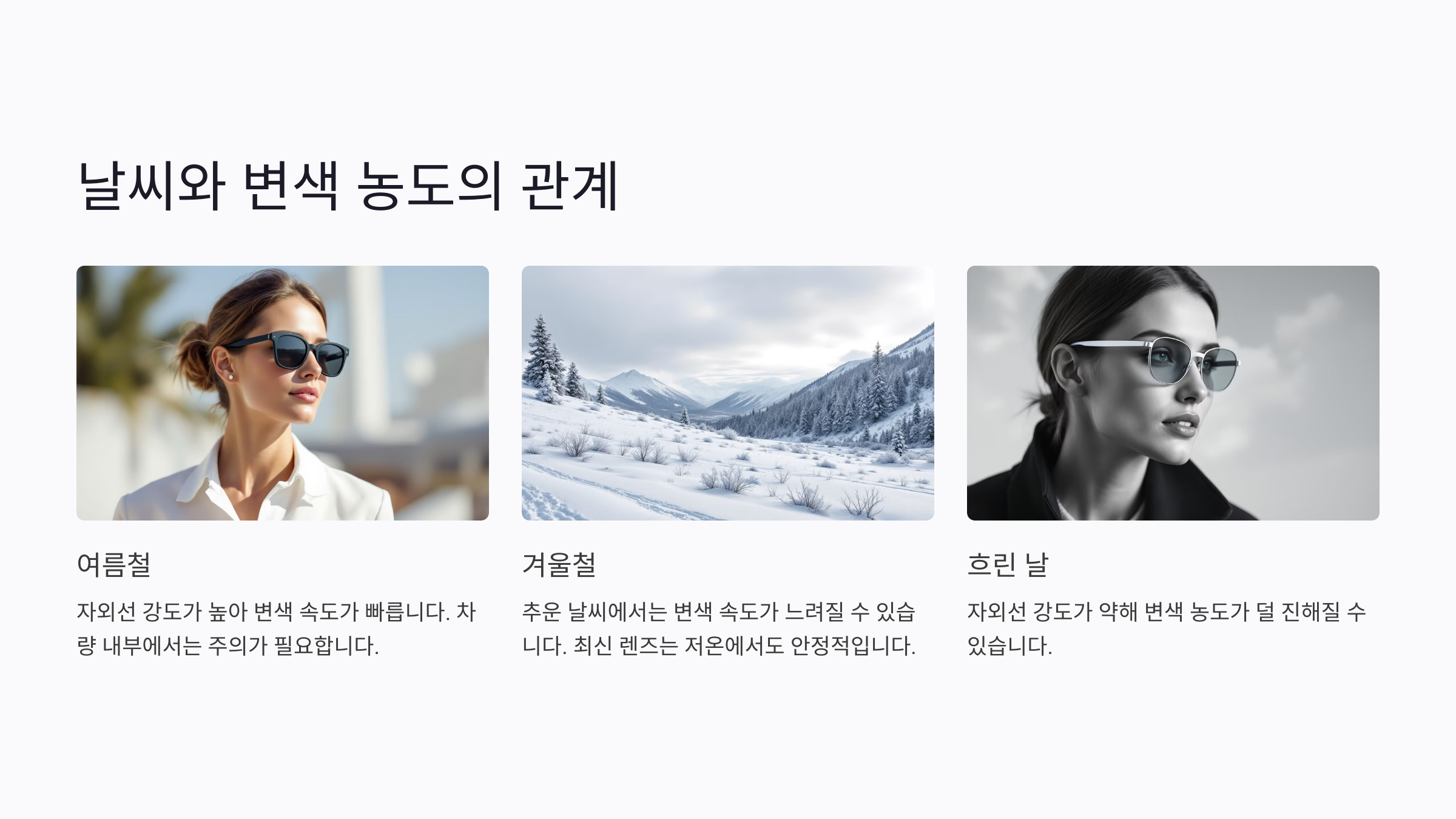 2. 겨울철: 추운 날씨에서는 렌즈의 화학 반응이 느려져 변색 속도가 느려질 수 있어요. 하지만 최신 변색 렌즈는 저온에서도 안정적으로 작동하도록 설계돼 있어요.