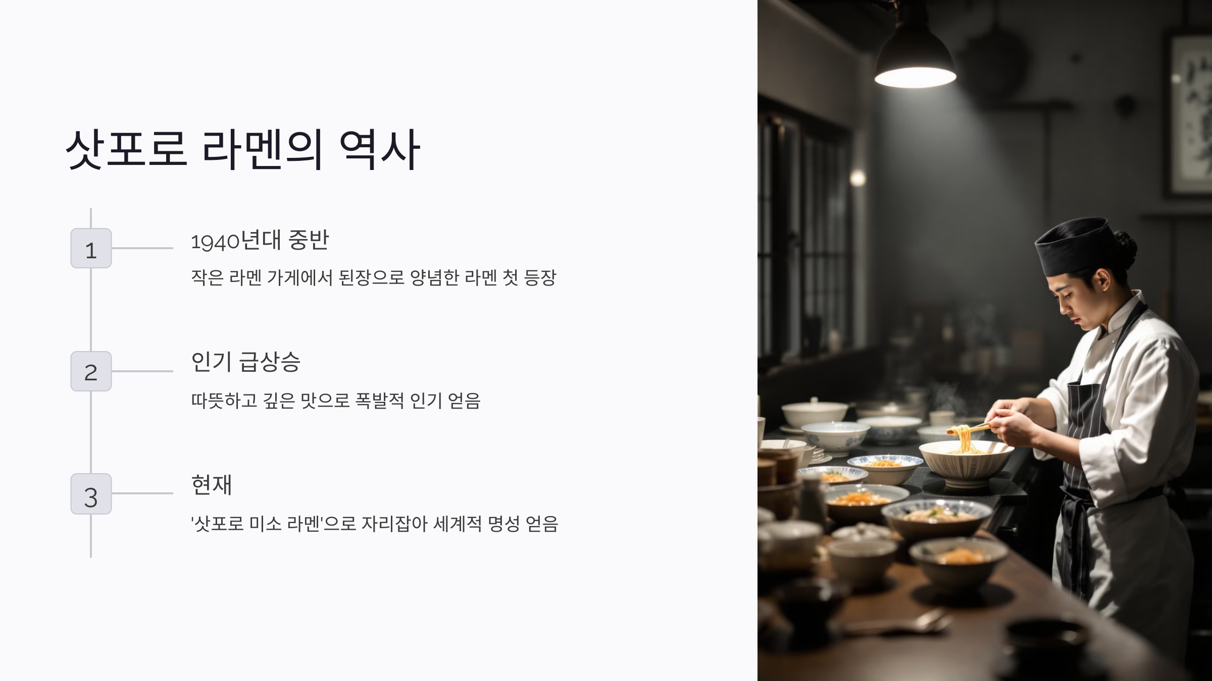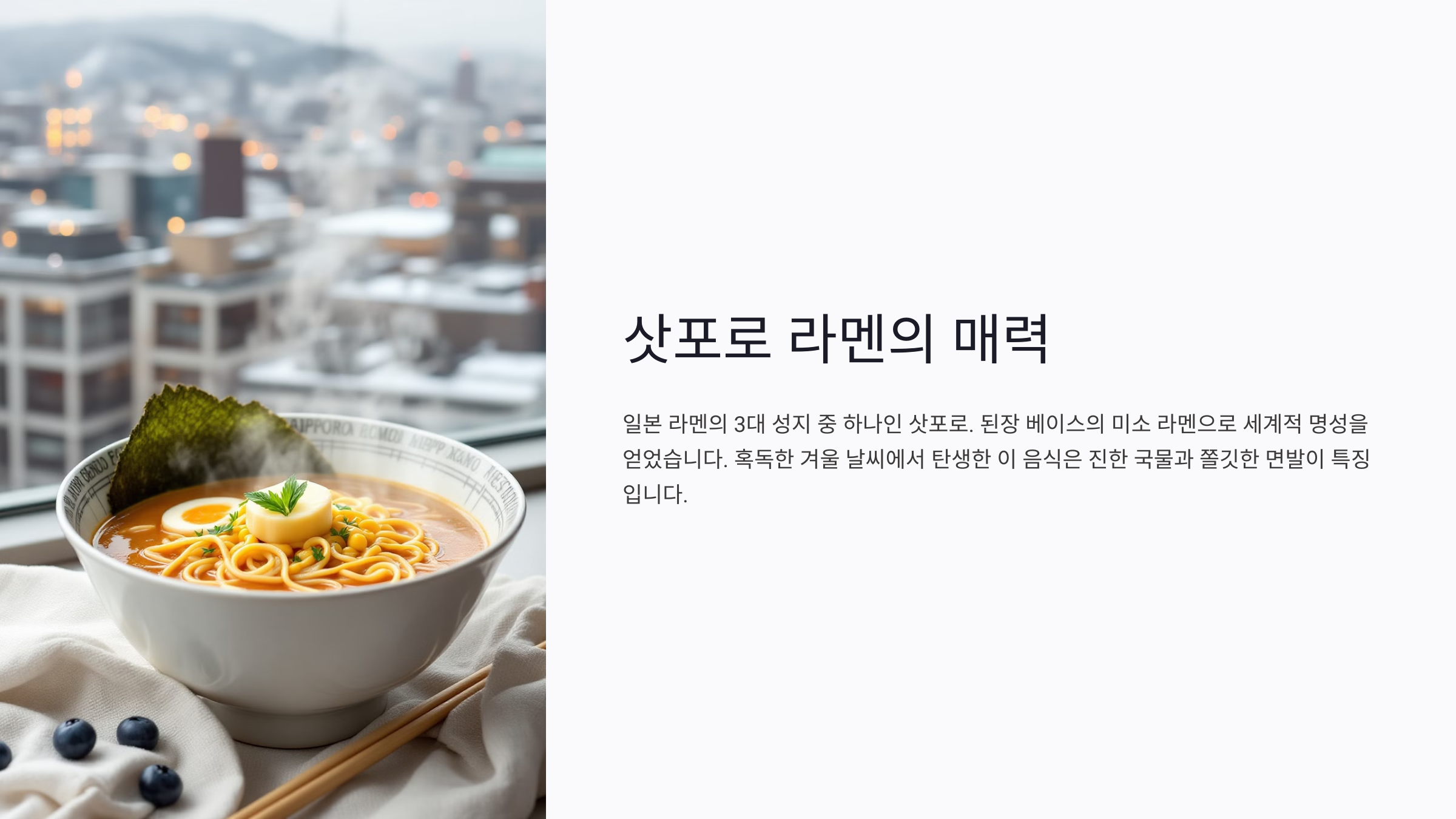 지금의 삿포로 라멘은 미소라멘뿐만 아니라 쇼유(간장) 라멘, 시오(소금) 라멘 등 다양한 변형 버전도 선보이고 있어요. 하지만 원조 미소라멘의 명성을 잇는 맛은 여전히 전 세계 미식가들의 사랑을 받고 있답니다.