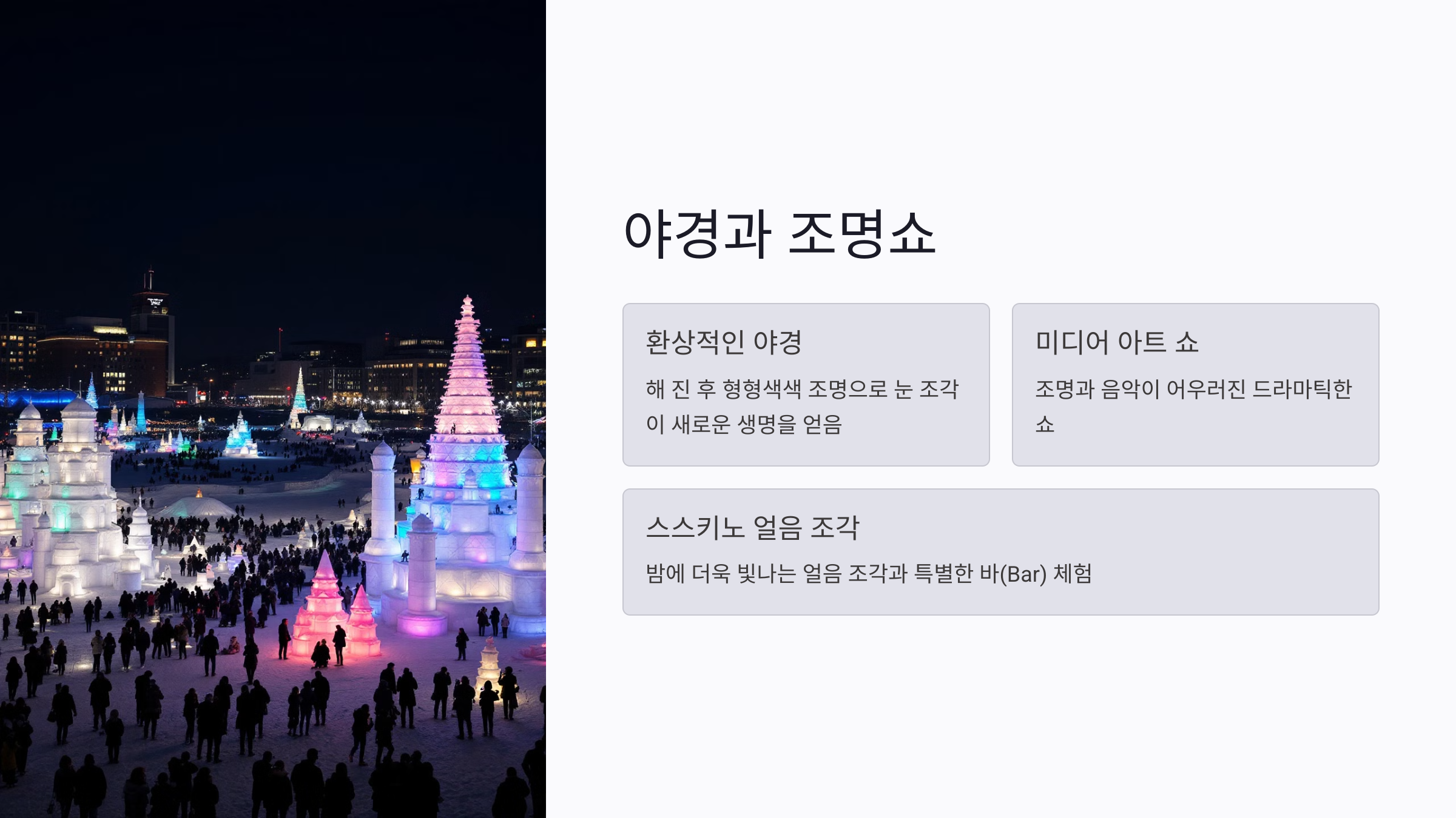 A8. 조명쇼는 보통 저녁 10시까지 운영돼요. 낮에는 눈 조각의 디테일을, 밤에는 조명의 아름다움을 즐길 수 있으니 시간에 맞춰 방문해 보세요.