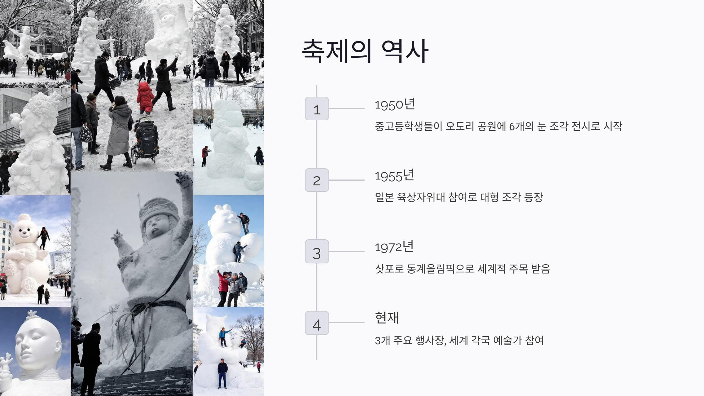 삿포로 눈축제는 1950년에 삿포로의 중고등학생들이 오도리 공원에 만든 6개의 눈 조각에서 시작됐어요. 당시 작은 규모로 시작된 이 축제는 삿포로 시민들의 열정과 창의력을 보여주는 자리였답니다. 이후 시간이 지나면서 이 축제는 점차 커졌고, 1955년에는 일본 육상자위대가 눈 조각 제작에 참여하며 대형 조각이 전시되기 시작했어요.