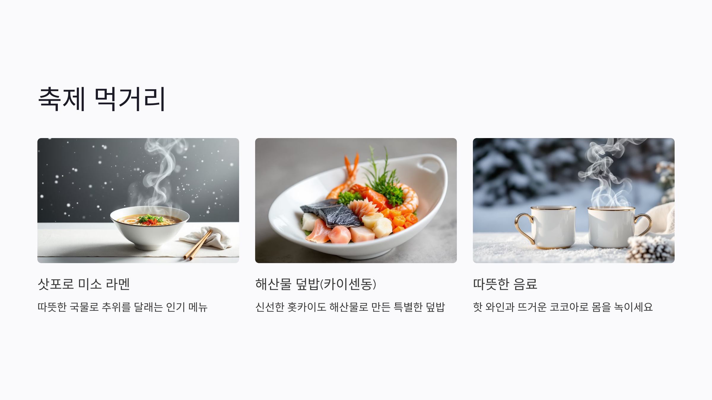 A5. 삿포로 미소 라멘, 해산물 덮밥(카이센동), 핫 와인, 치즈 타르트 등 홋카이도의 대표 음식을 추천드려요.
