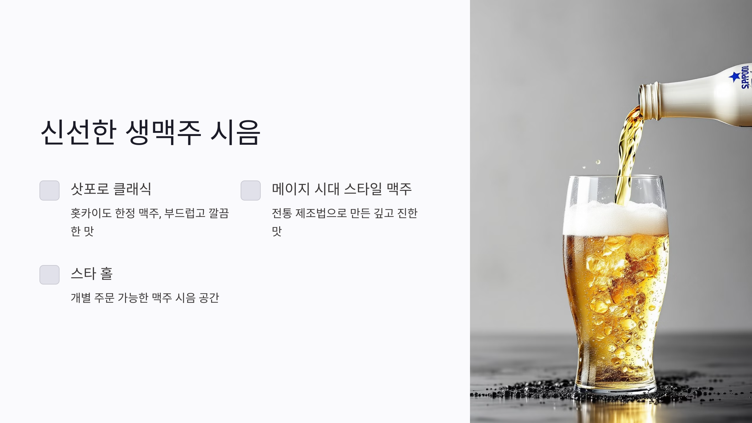 삿포로 맥주가 유명한 이유 중 하나는 홋카이도의 청정 자연과 고품질의 원재료에 있어요. 홋카이도산 보리와 깨끗한 물을 사용해 만들어진 삿포로 맥주는 깊고 진한 맛으로 전 세계 맥주 애호가들에게 사랑받고 있어요. 특히 삿포로 클래식(Sapporo Classic)은 홋카이도에서만 구매할 수 있어 지역 한정 맥주로 인기가 많답니다.