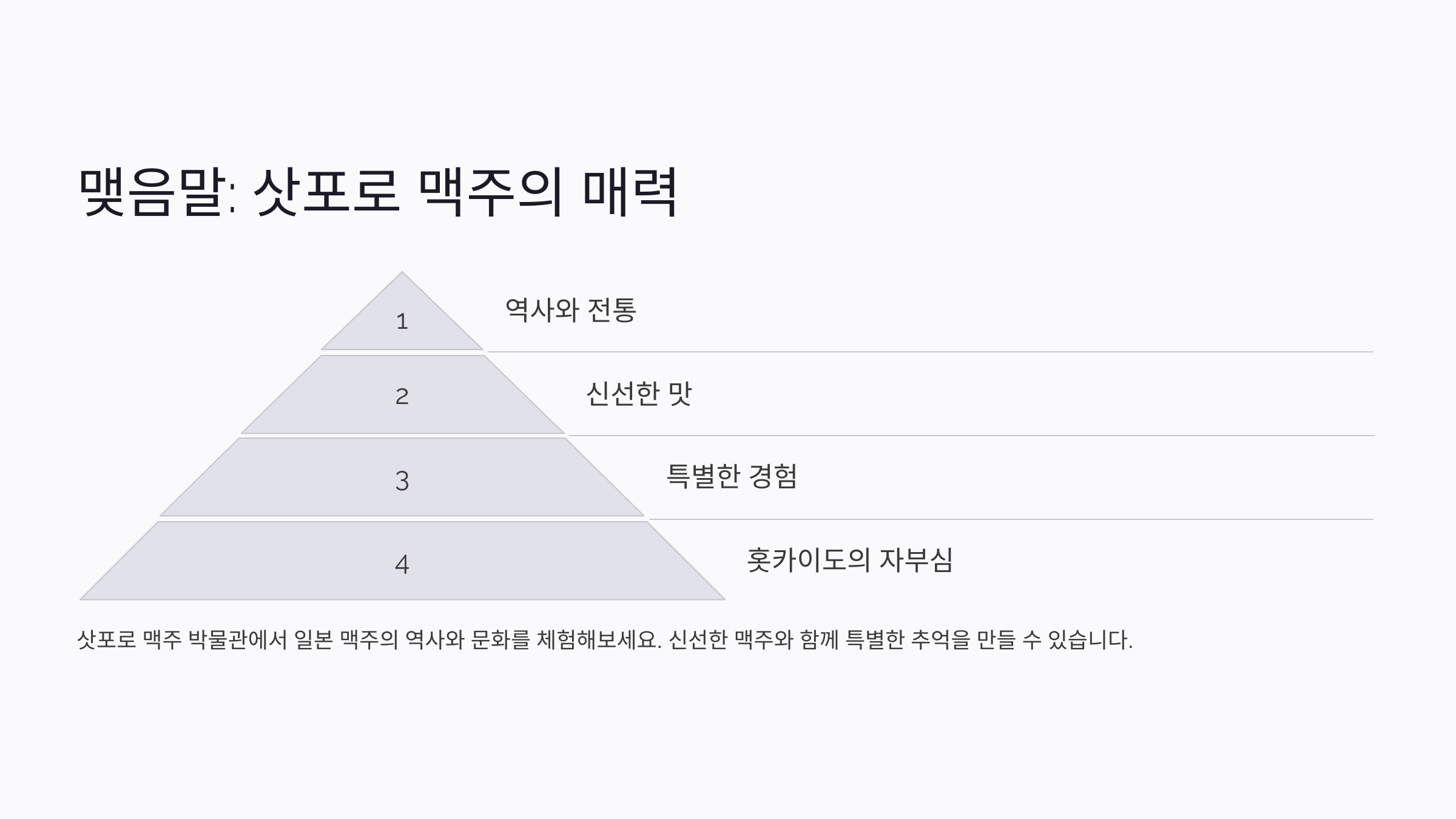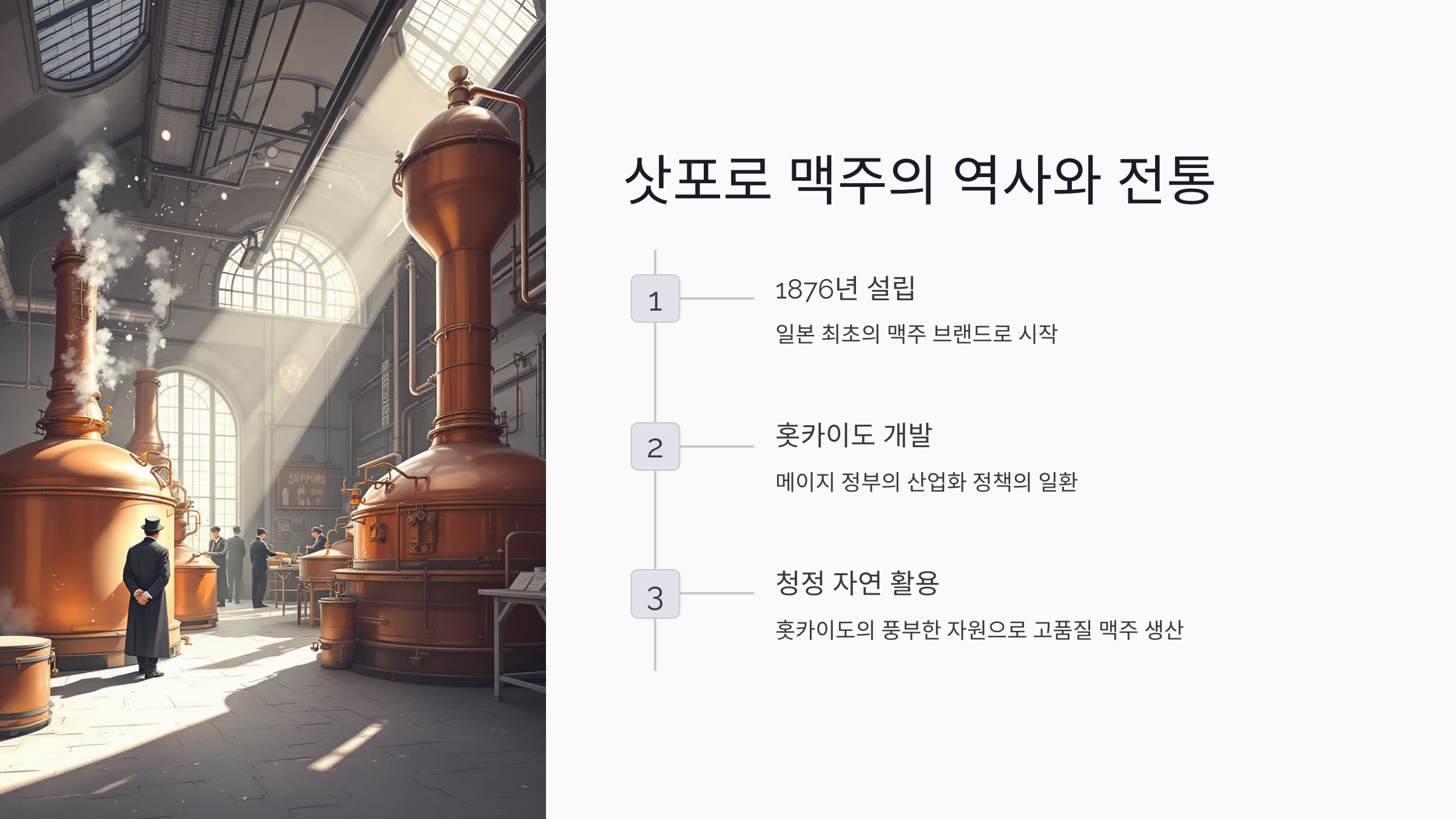이처럼 삿포로 맥주는 일본 맥주의 대표 주자로 자리 잡았으며, 오늘날에도 전 세계 시장에서 꾸준히 사랑받고 있어요. 박물관 투어를 통해 이들의 자부심 넘치는 역사와 문화를 깊이 이해해 보세요.