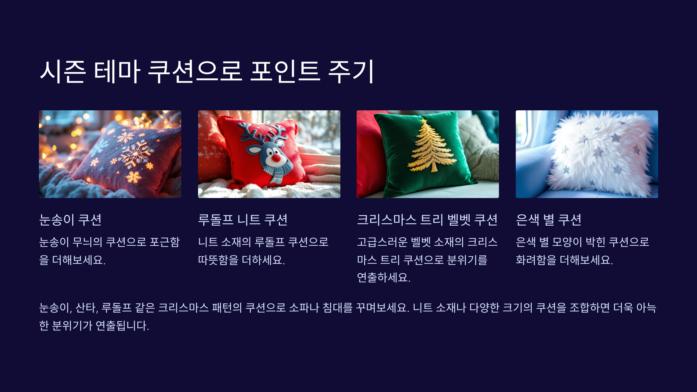 눈송이, 산타, 루돌프 같은 크리스마스 패턴의 쿠션이 효과적입니다.