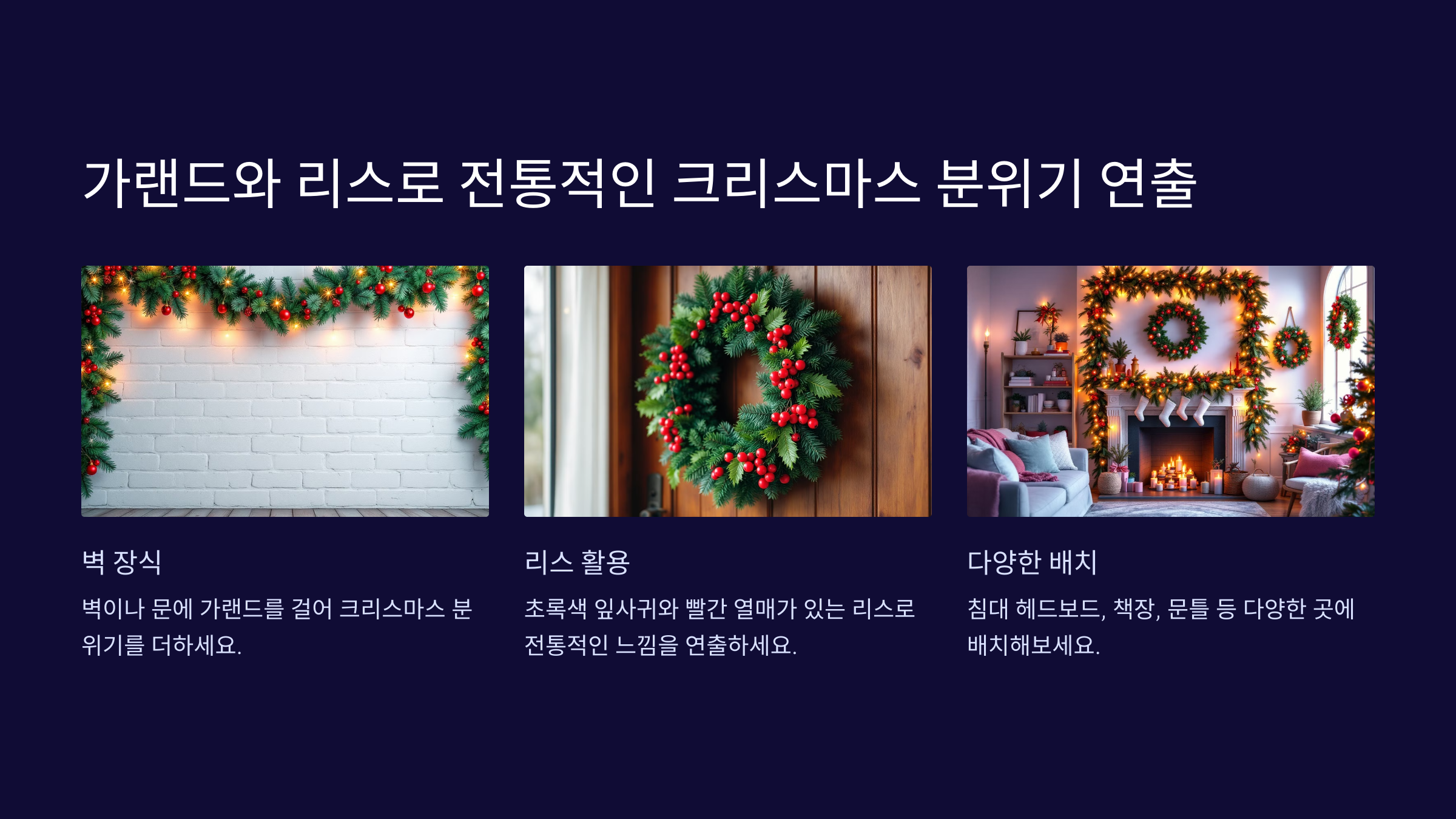 가랜드와 리스는 크리스마스 분위기를 완성하는 데 중요한 역할을 합니다.