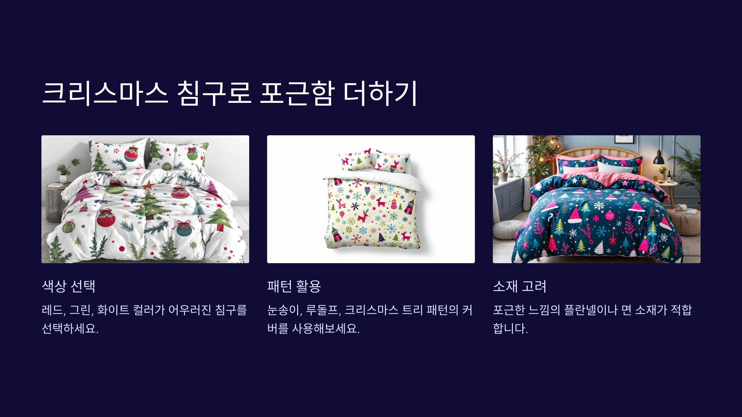 따뜻하고 아늑한 침구로 크리스마스 밤의 포근함을 느껴보세요.