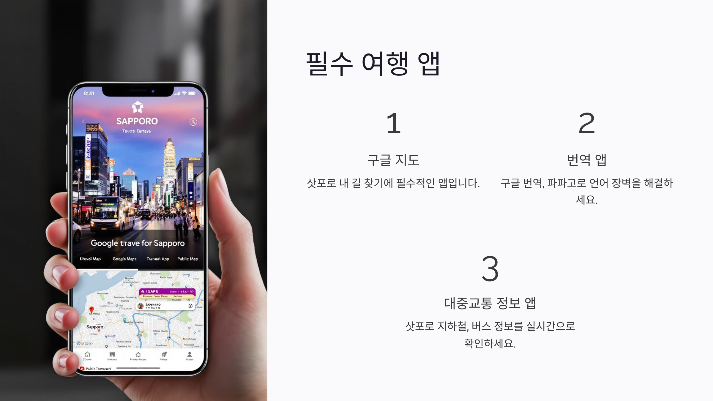 A8. 구글 지도, 번역 앱(구글 번역, 파파고), 삿포로 대중교통 정보 어플은 필수예요. 여행 중 길 찾기와 언어 문제 해결에 큰 도움이 돼요.