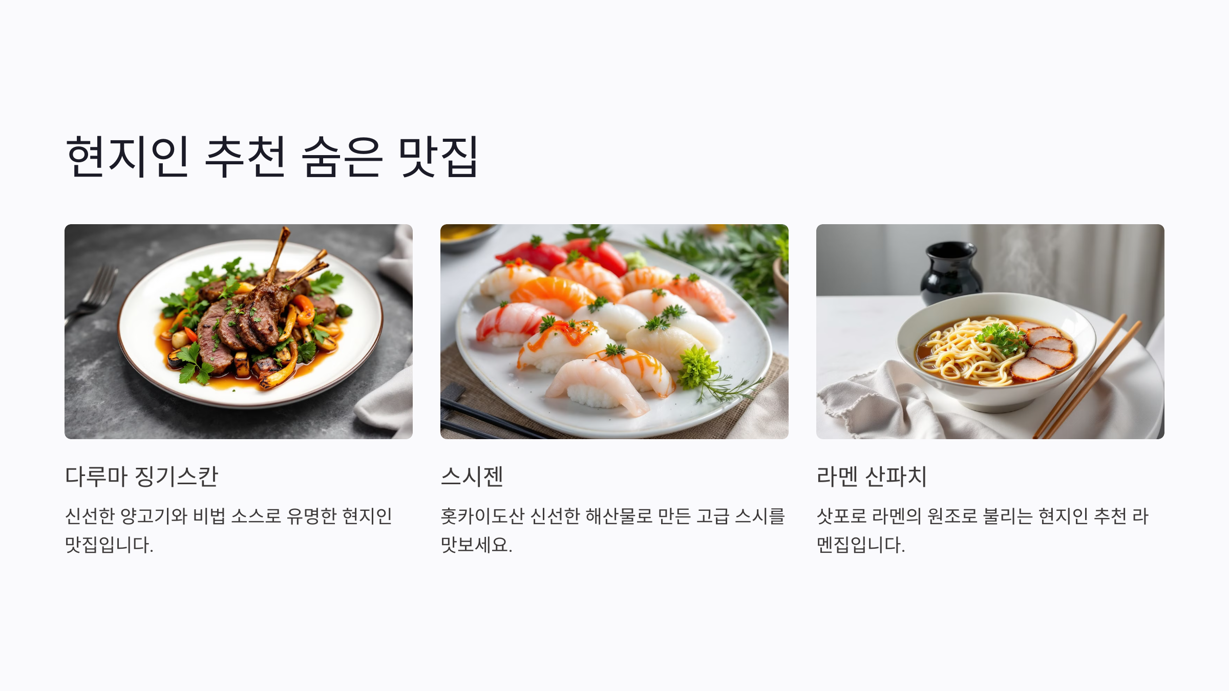 삿포로에는 관광객뿐만 아니라 현지인들이 즐겨 찾는 숨은 맛집들이 많아요. 아래는 현지에서 사랑받는 추천 맛집 리스트에요: