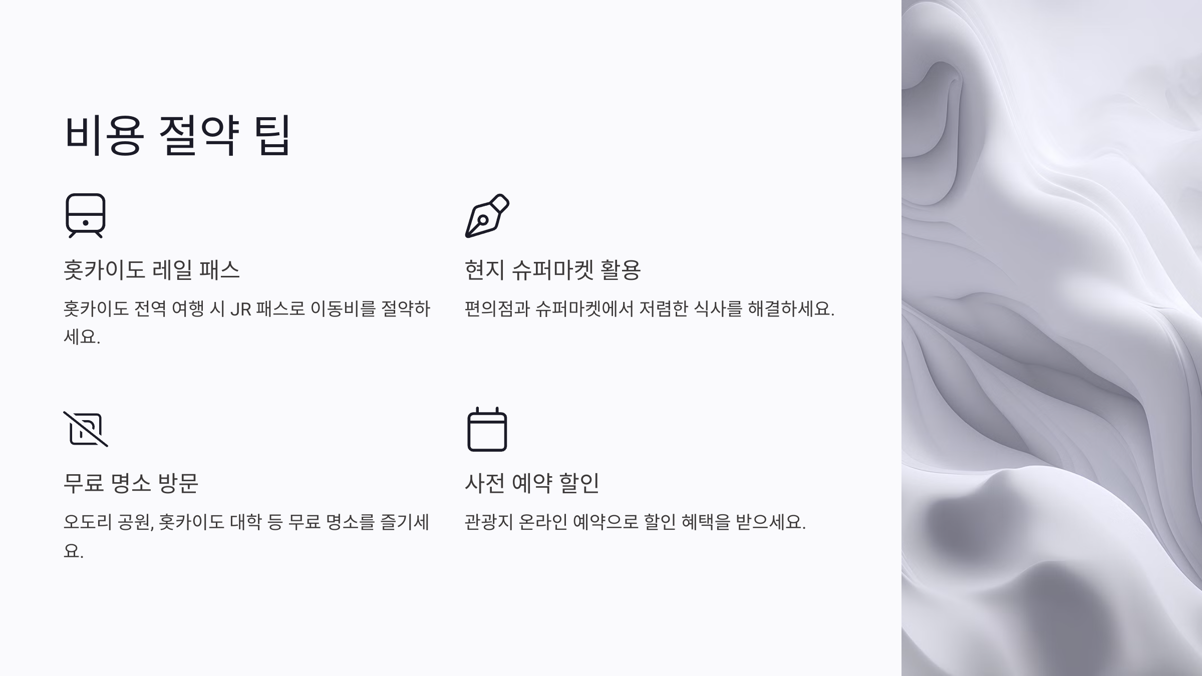 삿포로는 합리적인 예산으로도 충분히 즐길 수 있는 도시예요. 아래의 팁을 참고해 여행 비용을 효과적으로 절약해 보세요: