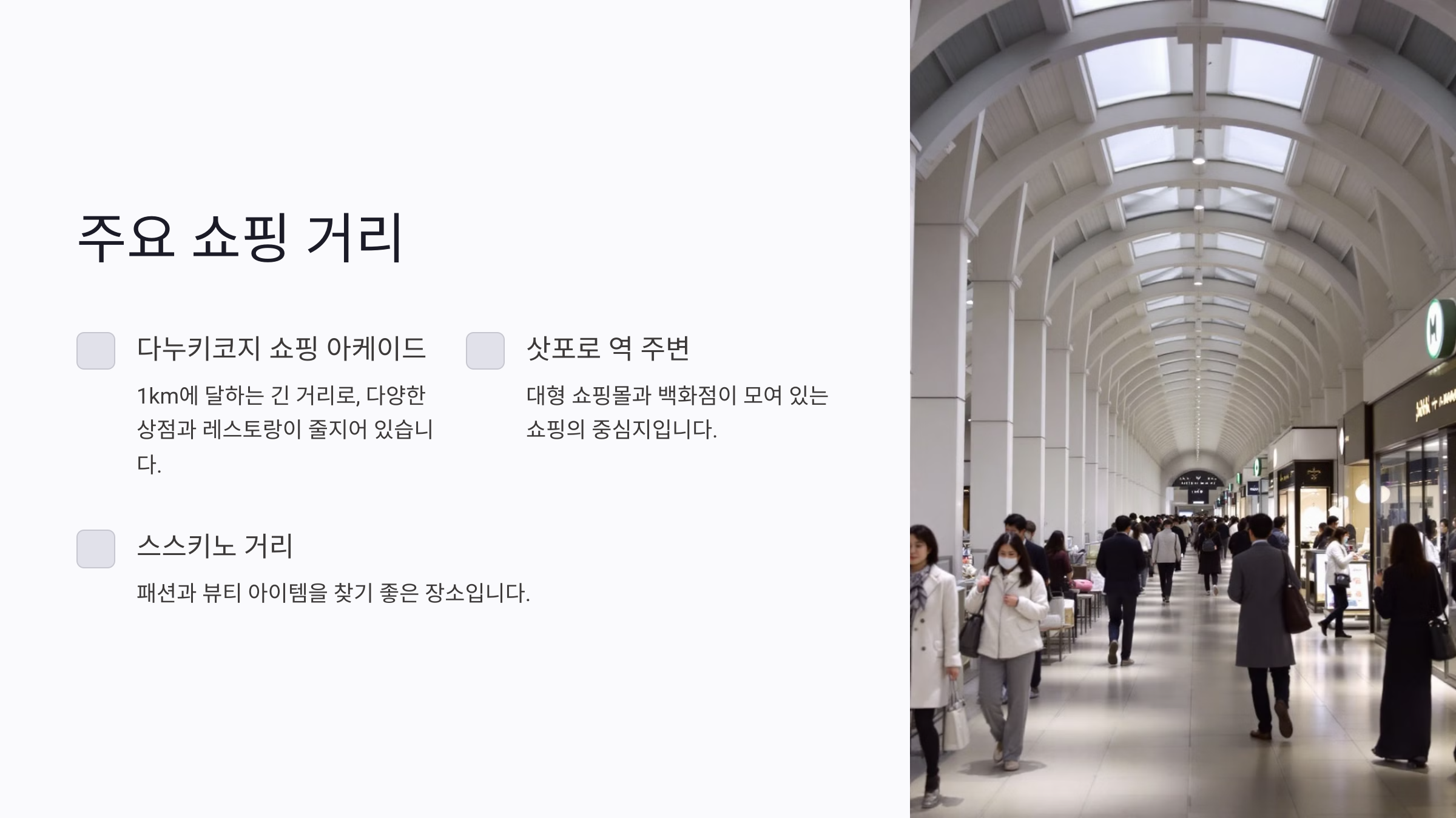 삿포로의 주요 쇼핑 거리들은 다양한 아이템을 찾기에 적합한 장소들이에요. 걸으면서 쇼핑의 재미를 느껴보세요!