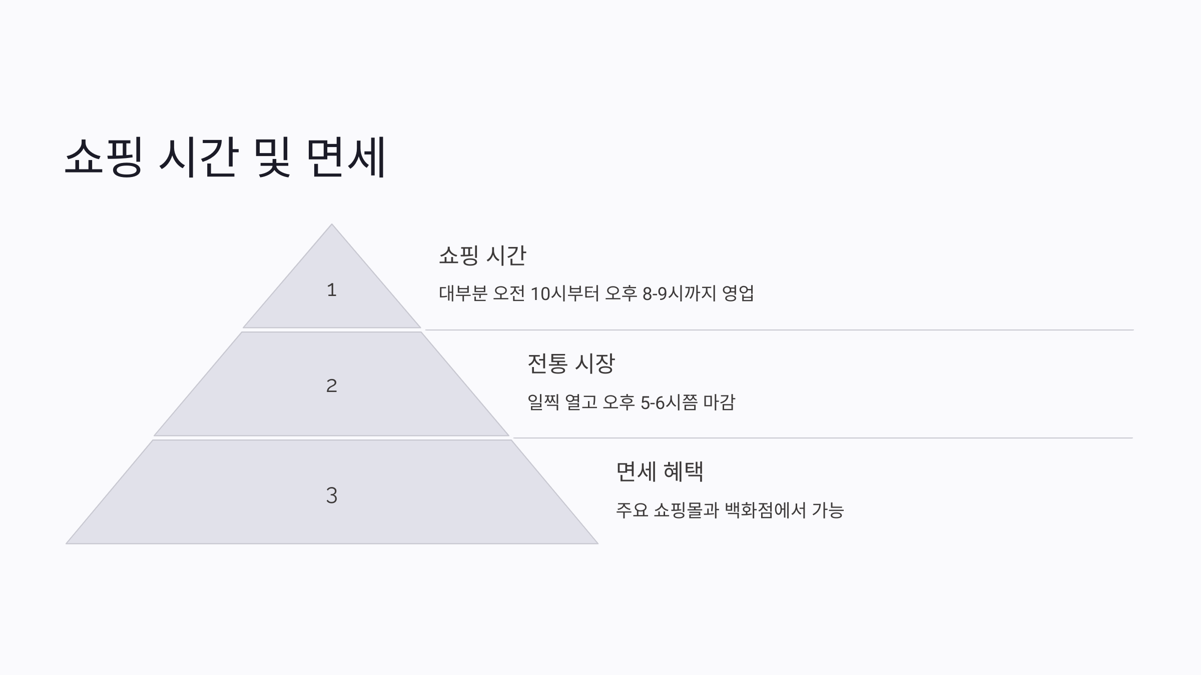 A7. 대부분의 백화점과 쇼핑몰은 오전 10시부터 오후 8~9시까지 영업해요. 전통 시장은 대체로 더 이른 시간에 문을 열고, 오후 5~6시쯤 문을 닫는 경우가 많아요.