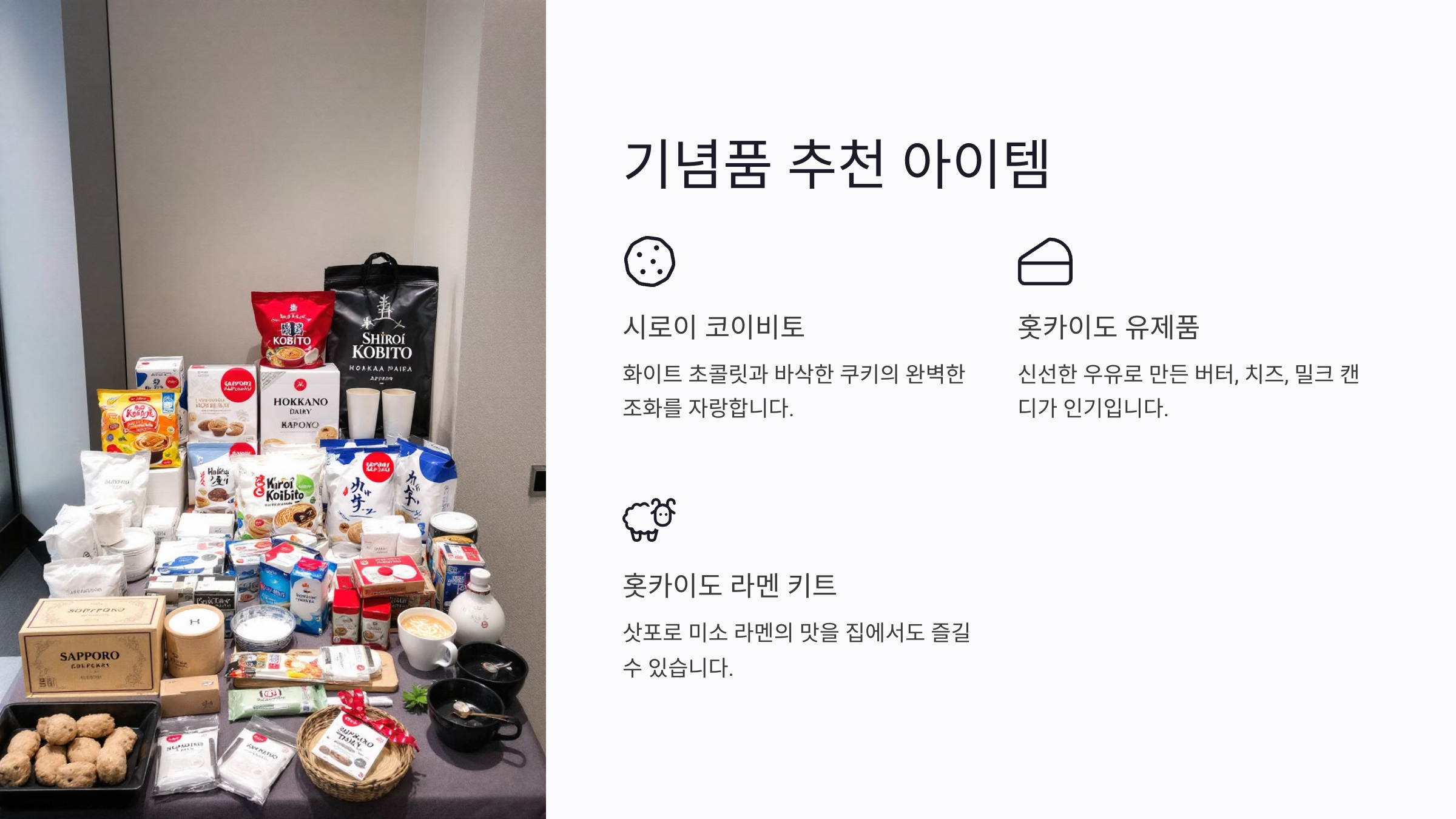 삿포로 여행을 마치고 돌아가기 전에, 소중한 사람들에게 선물하거나 스스로 여행의 추억을 간직하기 위한 기념품을 꼭 챙겨보세요. 삿포로에서 인기 있는 기념품 아이템들을 정리했어요: