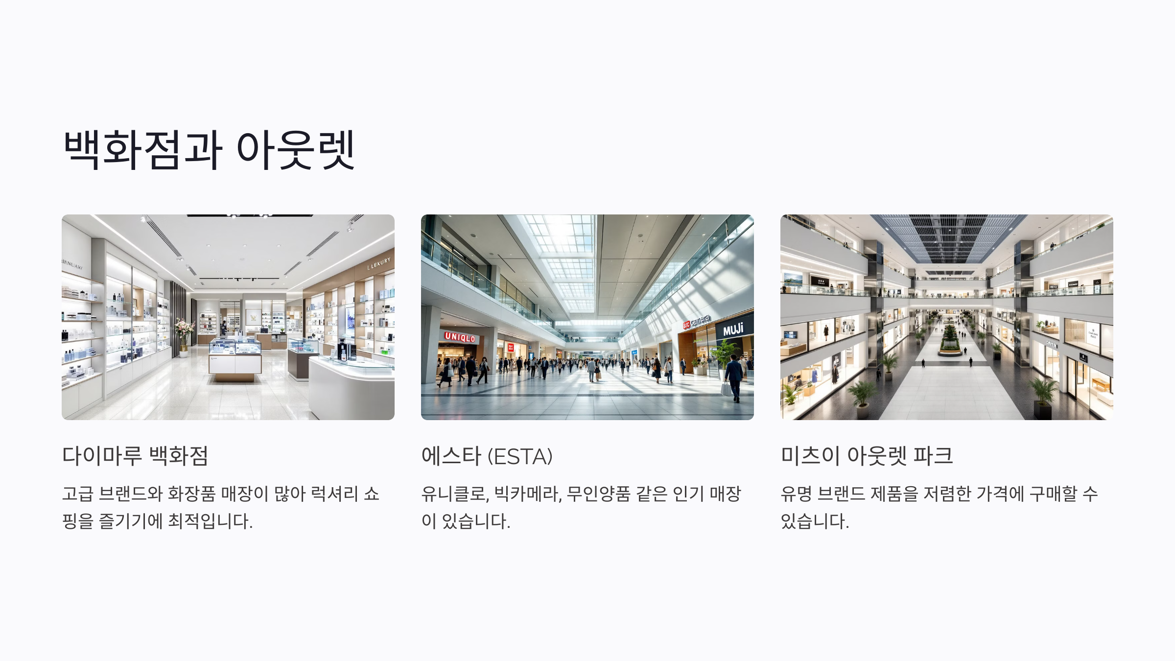 삿포로는 고급 브랜드부터 아웃렛 매장까지 다양한 쇼핑 옵션을 제공하는 백화점과 쇼핑몰들이 많아요. 삿포로에서 놓쳐서는 안 될 쇼핑 명소를 소개할게요.
