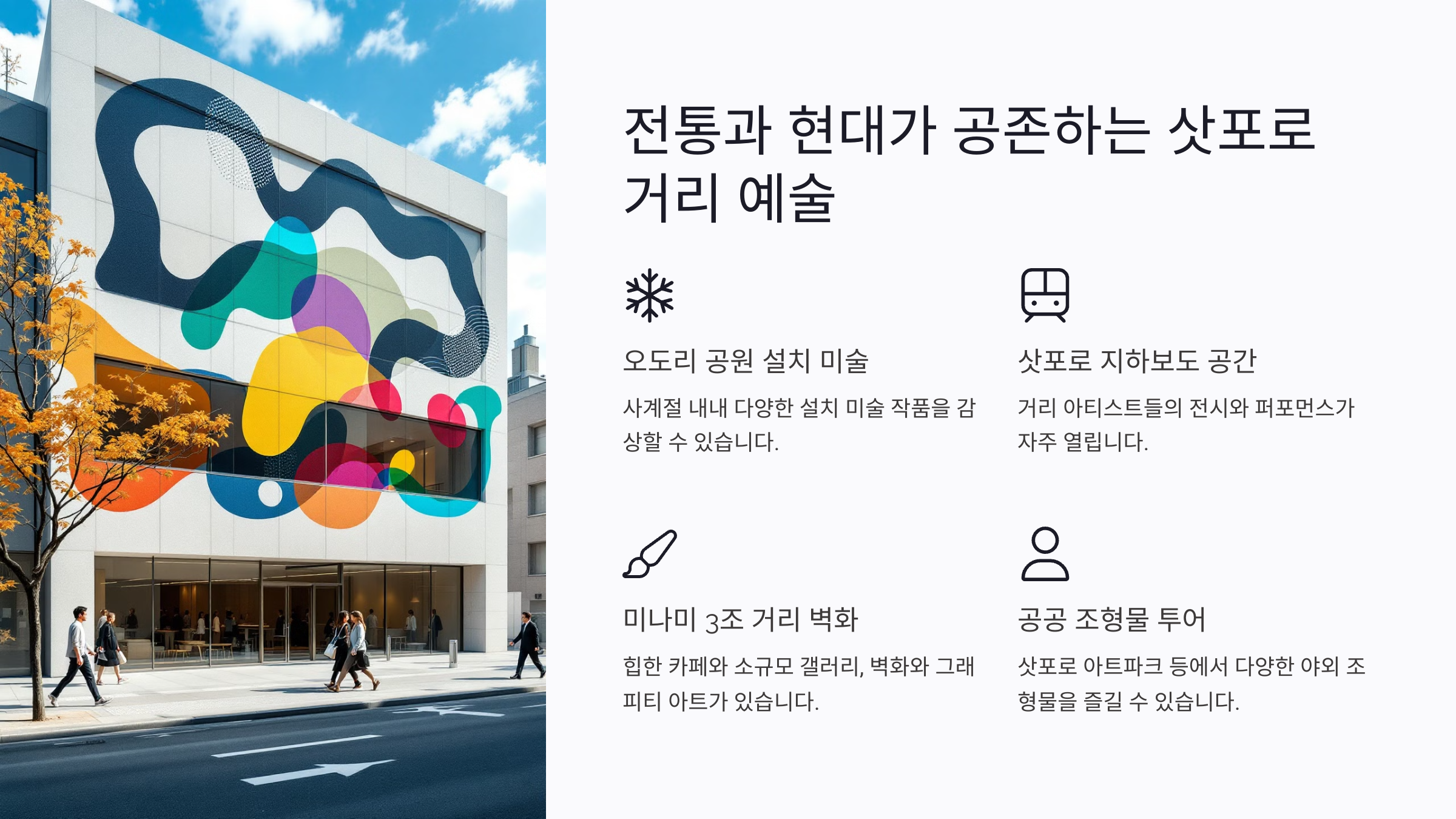 삿포로는 도시 곳곳에서 거리 예술을 만날 수 있는 매력적인 도시예요. 전통과 현대가 공존하는 독특한 분위기를 자아내며, 지역 예술가들의 창의적인 작품들이 도시를 더욱 생동감 있게 만들어줘요.