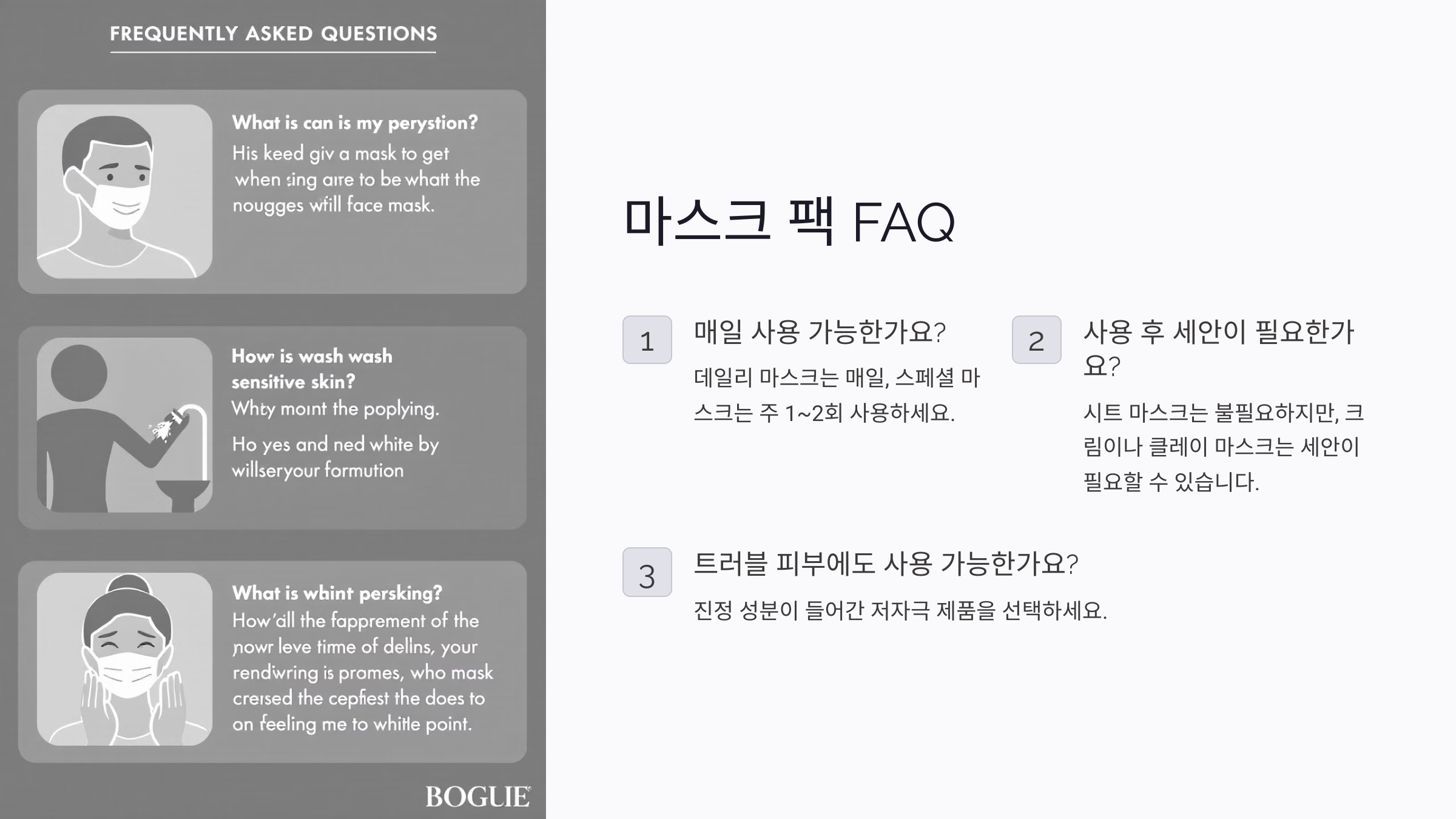 A2. 제품마다 다르지만, 보통 시트 마스크는 세안이 필요하지 않아요. 크림 타입이나 클레이 마스크는 세안이 필요할 수 있어요.