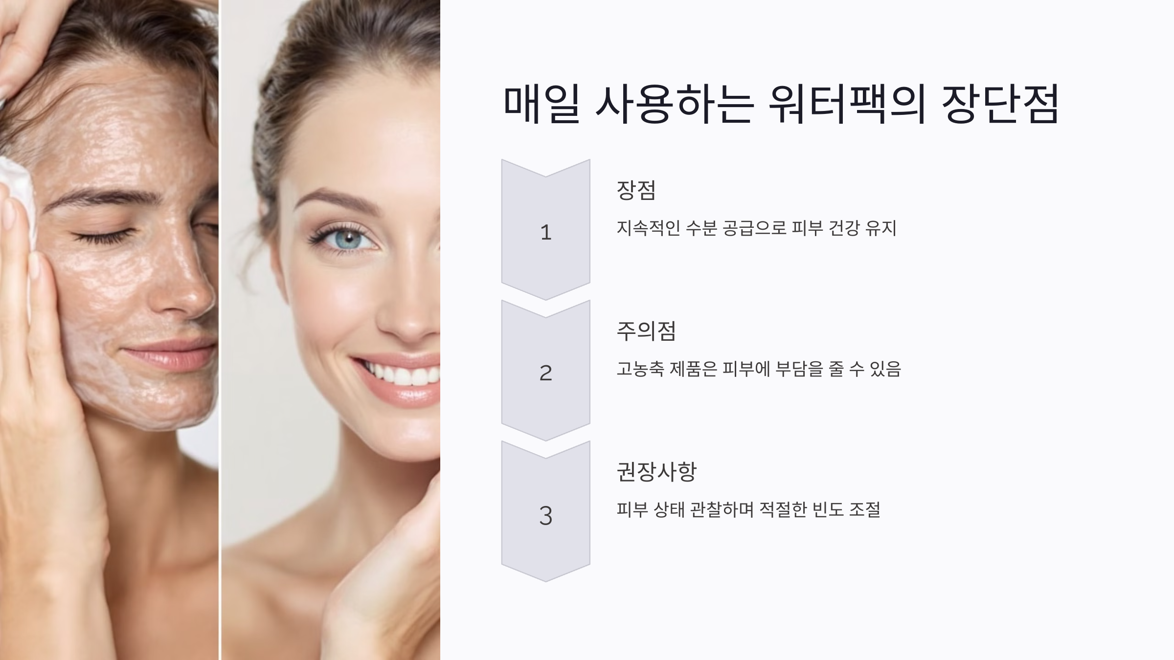 결론적으로, 워터팩은 데일리 케어에 적합하고, 세럼 팩은 주 1~2회 집중 관리용으로 사용하는 것이 이상적이에요. 두 가지를 적절히 조합하면 피부 관리 루틴이 한층 업그레이드될 거예요.