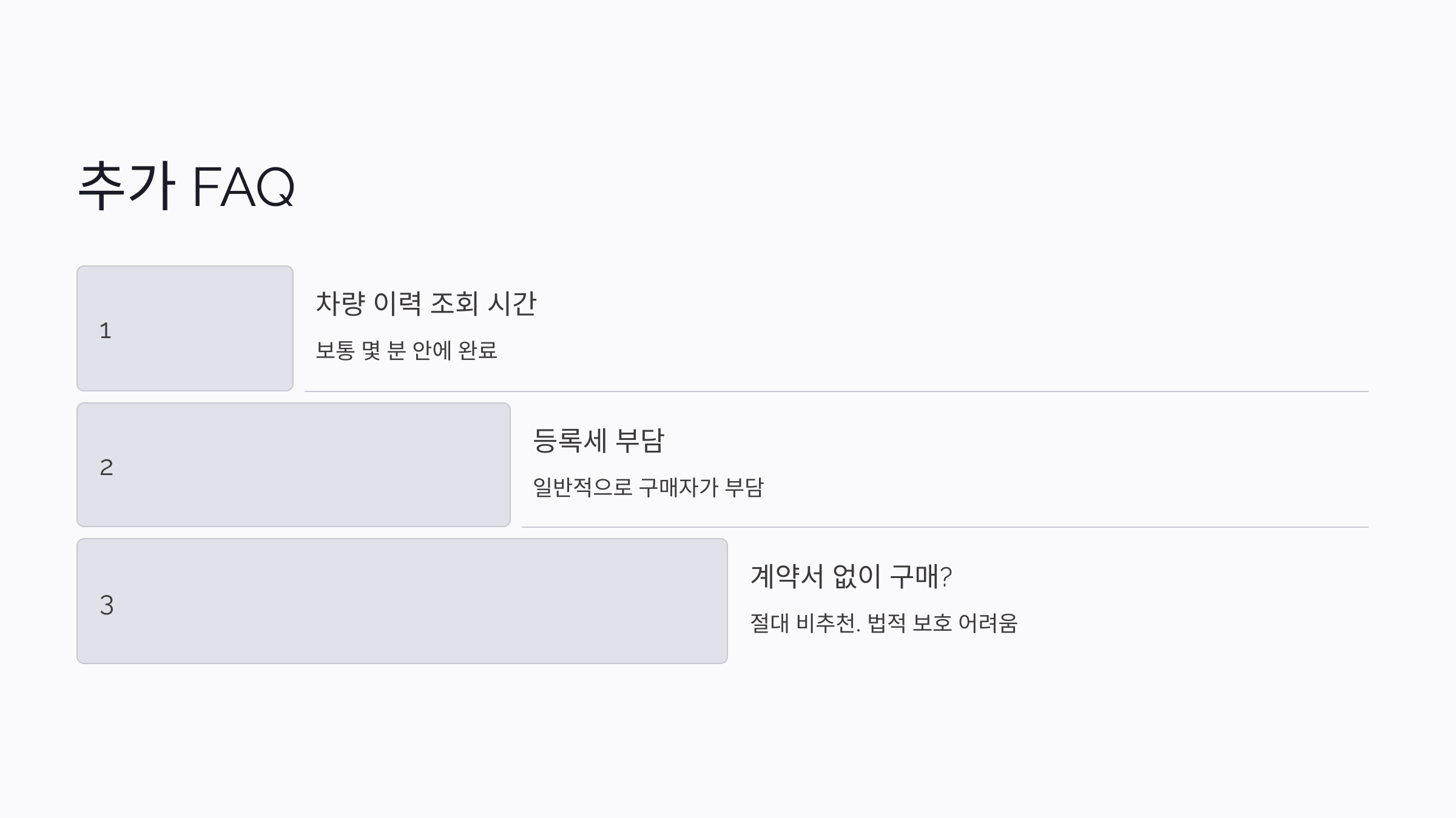 A6. 절대 추천하지 않아요. 계약서 없이 거래를 진행하면 사고 이력이나 차량 상태와 관련된 문제가 발생했을 때 법적으로 보호받기 어려워요. 서면 계약서를 반드시 작성하고 보관하세요.