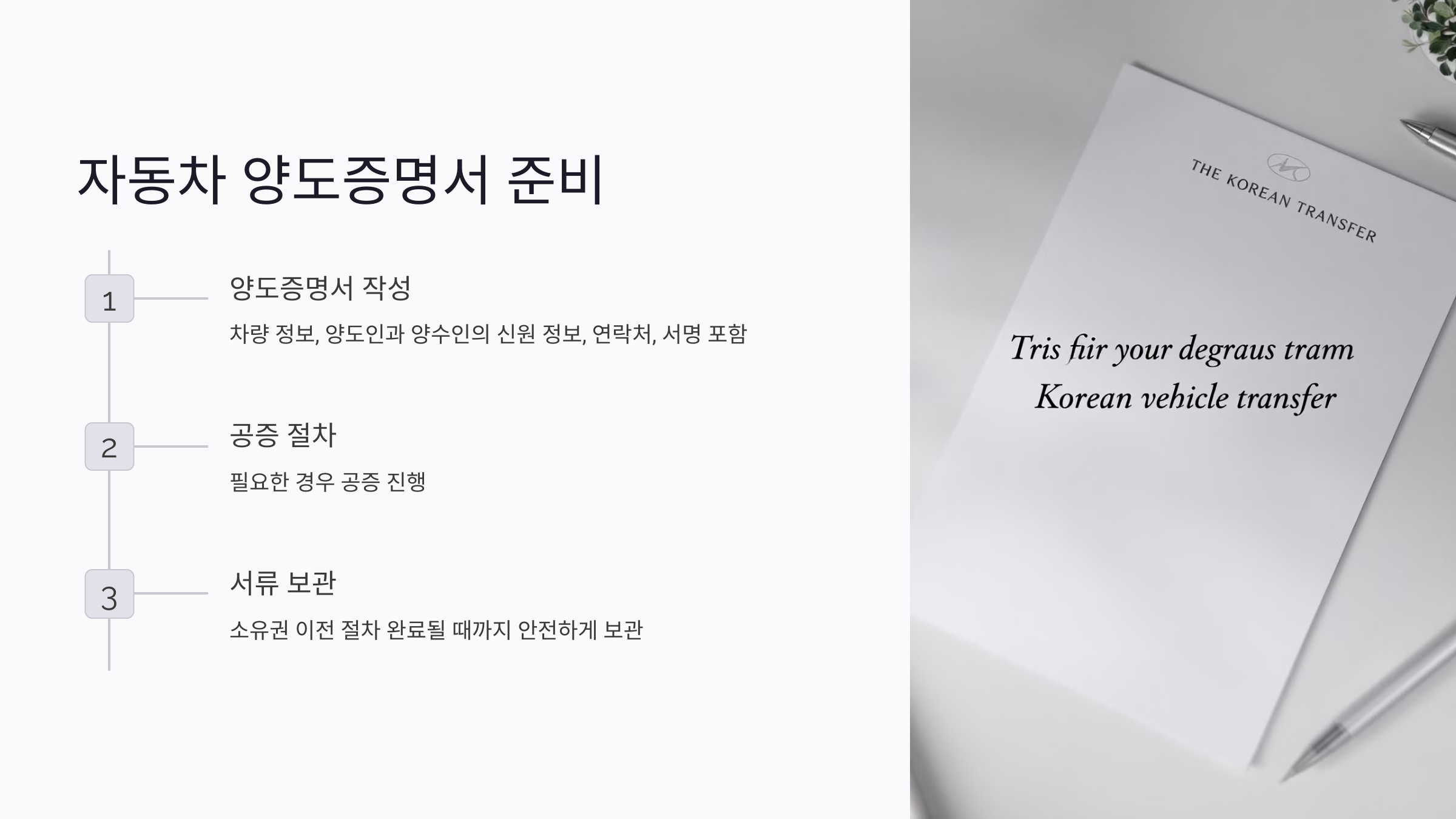 자동차 양도증명서는 차량 소유권을 판매자에서 구매자로 이전하기 위해 필요한 서류예요. 양도증명서에는 차량 정보와 함께 양도인(판매자)과 양수인(구매자)의 신원 정보, 연락처, 서명이 포함되어야 해요. 이 서류는 소유권 이전 등록을 위한 필수 문서로 간주돼요.