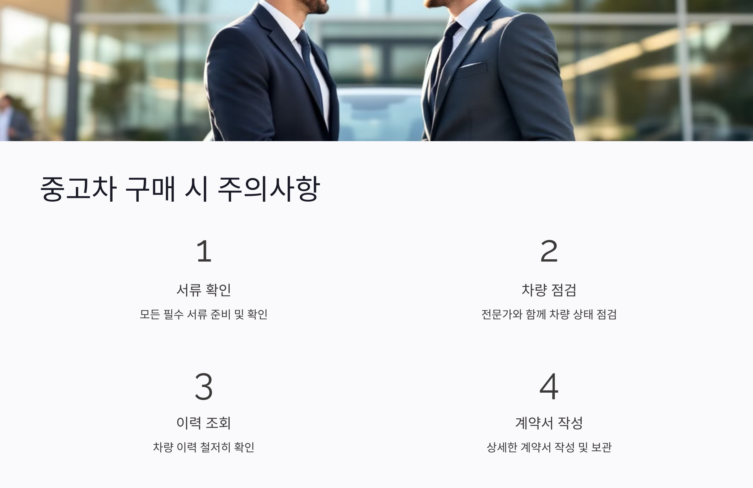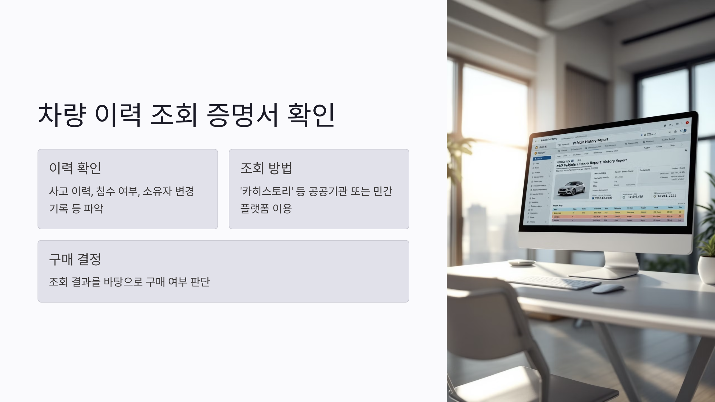 특히, 시세보다 저렴한 차량이나 사고 이력이 의심되는 차량의 경우 반드시 이력 조회를 통해 문제를 사전에 파악해야 해요. 조회 결과를 바탕으로 구매를 진행할지 판단하고, 위험한 거래는 피하는 것이 좋아요.
