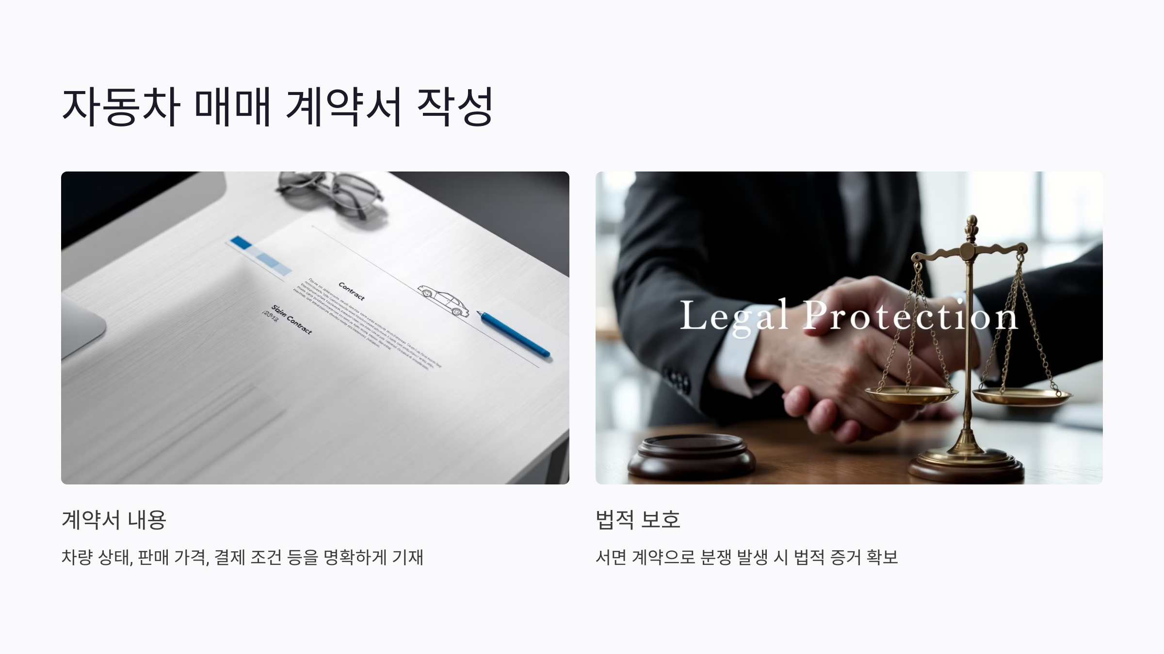 특히 중고차의 경우 차량 상태에 따라 가치가 크게 달라질 수 있기 때문에, 계약서에 차량의 사고 이력, 침수 여부, 주행거리 등을 명확히 기재하는 것이 좋아요. 계약서에 포함된 정보는 구매 후 발생할 수 있는 문제를 예방하는 데 큰 도움이 돼요.
