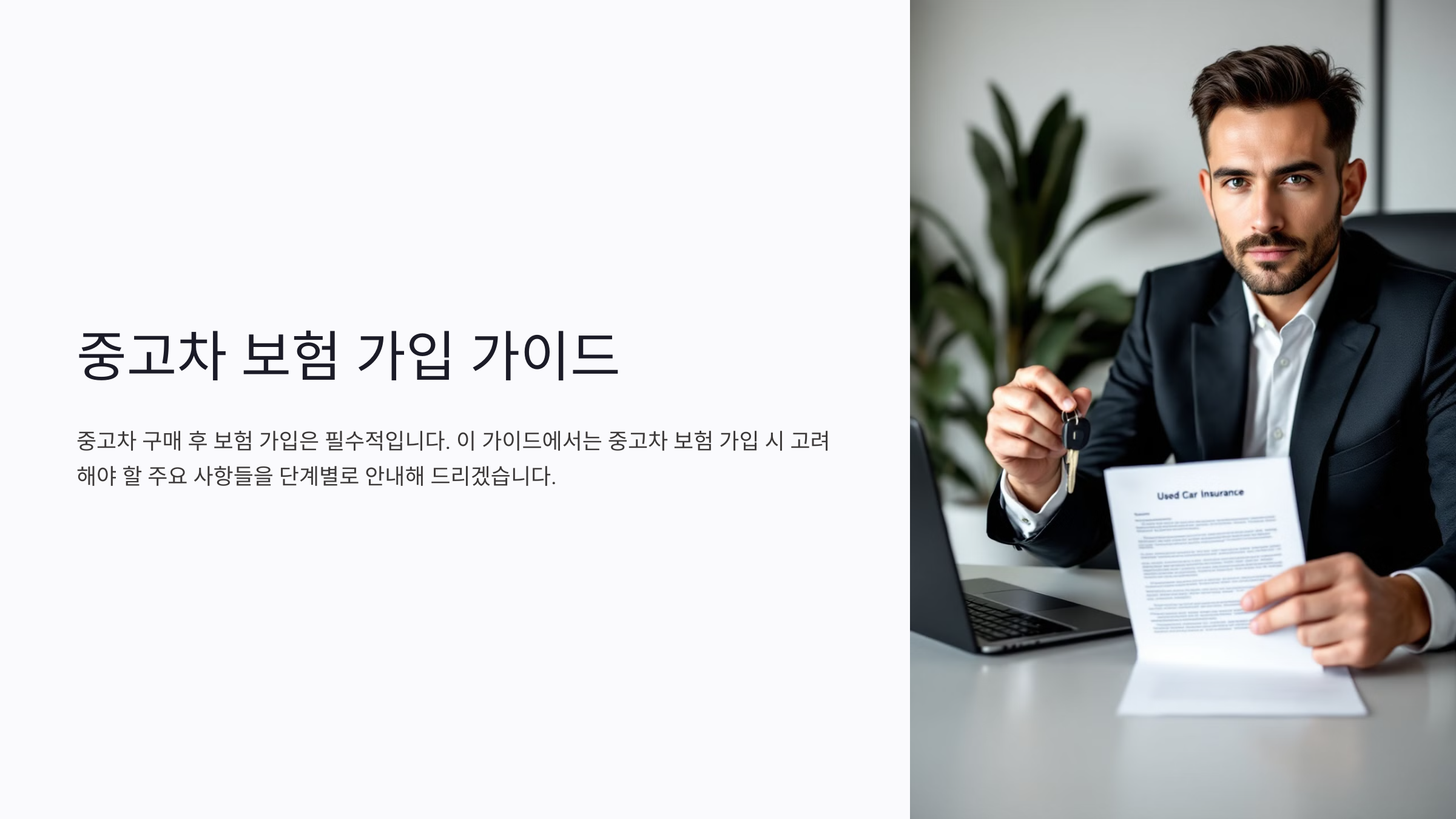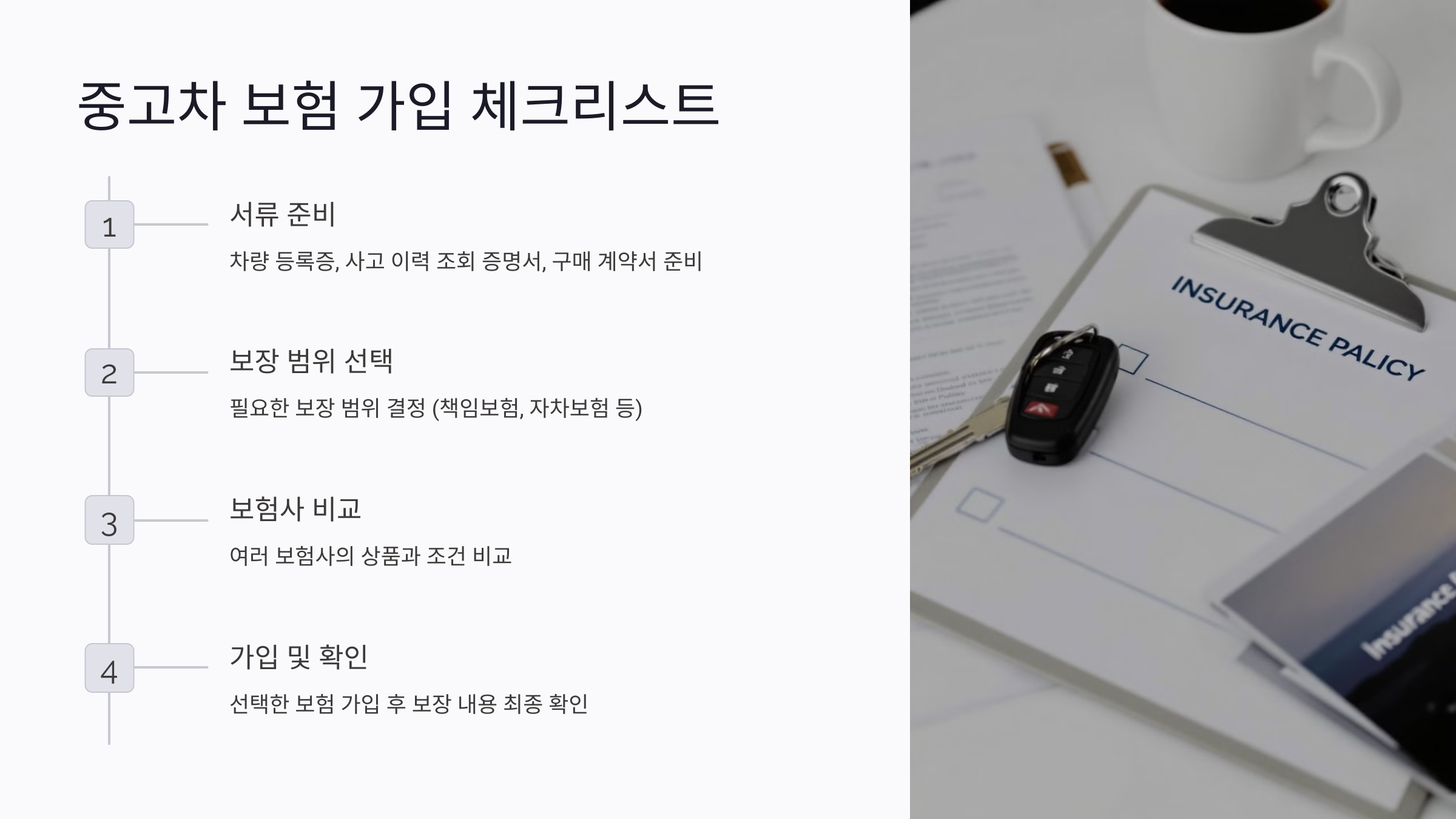 중고차를 구매한 후 보험 가입은 필수적인 절차예요. 중고차는 신차와 달리 상태와 과거 이력에 따라 보험 조건이 달라질 수 있어요. 적합한 보험 상품을 선택하지 않으면 예상치 못한 사고나 문제가 발생했을 때 경제적 부담이 커질 수 있답니다. 이번 글에서는 중고차 보험 가입 시 고려해야 할 주요 사항들을 단계별로 안내할게요.